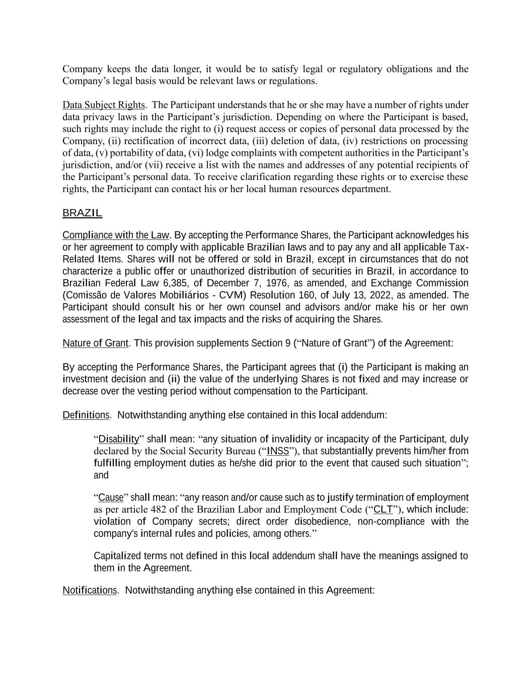 公司保存数据的时间更长,这将是为了满足法律或监管义务和公司的法律基础将是相关的法律或法规。数据主体权利。参与者了解,他或她可能拥有参与者管辖范围内数据隐私法规定的多项权利。根据参与者的所在地,此类权利可能包括以下权利:(i)要求访问或复制公司处理的个人数据,(ii)更正不正确的数据,(iii)删除数据,(iv)对数据处理的限制,(v)数据的可移植性,(vi)向参与者管辖范围内的主管当局提出投诉,和/或(vii)收到载有参与者个人数据的任何潜在接收者的姓名和地址的名单。要获得有关这些权利的澄清或行使这些权利,参与者可以联系他或她当地的人力资源部门。巴西遵守法律。通过接受履约份额,参与者确认其同意遵守适用的巴西法律并支付任何和所有适用的与税收相关的项目。根据经修订的1976年12月7日巴西联邦法律第6385号和经修订的2022年7月13日交易委员会(Comiss ã o de Valores Mobili á rios-CVM)第160号决议,除非在不属于在巴西公开发售或未经授权分销证券的情况下,股票将不会在巴西发售或出售。参与者应咨询自己的法律顾问和顾问和/或对法律和税务影响以及收购股份的风险做出自己的评估。格兰特的性质。这一规定补充了协议第9节(“授予性质”):参与者通过接受业绩股份,同意(i)参与者正在做出投资决定,并且(ii)基础股份的价值不是固定的,并且可以在归属期内增加或减少,而无需向参与者提供补偿。定义。尽管这份地方增编中另有规定:“残疾”是指:“由社会保障局(“INSS”)正式宣布的任何参与者的无效或无行为能力的情况,实质上阻碍了他/她履行导致此类情况的事件之前所做的就业职责”;“原因”是指:“任何理由和/或原因,例如根据《巴西劳动和就业法》(“CLT”)第482条以正当理由终止雇佣,其中包括:违反公司机密;直接命令不服从、不遵守公司内部规则和政策等。”本地方增编中未定义的大写术语应具有协议中赋予它们的含义。通知。尽管本协议另有规定: