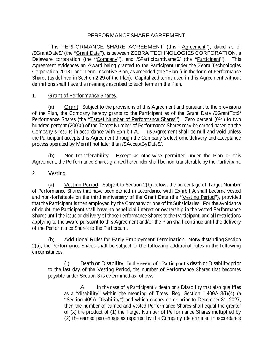 业绩份额协议本业绩份额协议(本“协议”),日期为/$ GrantDate $/(“授予日”),由ZEBRA TECHNOLOGIES CORPORATION,一家特拉华州公司(“公司”)和/$参与者Name $/(“参与者”)签署。本协议证明了根据经修订的Zebra Technologies Corporation 2018年长期激励计划(“计划”)以业绩份额(定义见计划第2.29节)的形式授予参与者的奖励。本协议中使用的没有定义的大写术语应具有计划中赋予此类术语的含义。1.授予业绩股份。(a)赠款。在遵守本协议规定的情况下,根据计划的规定,公司特此授予截至授予日的参与者/$ GrantTXT $/绩效股份(“绩效股份的目标数量”)。业绩份额目标数量的百分之零(0%)至百分之二百(200%)可根据公司根据附件 A的业绩赚取,本协议无效,除非参与者不迟于/$ AcceptBYDate $/通过公司由Merrill操作的电子交付和验收流程接受本协议。(b)不可转让性。除本计划或本协议另有许可外,根据本协议授予的业绩份额不得由参与者转让。2.归属。(a)授予期。在符合下文第2(b)节的规定下,已根据附件 A赚取的业绩股份目标数目的百分比将于授予日第三个周年(“授予期”)成为归属及不可没收,前提是该参与者随后受雇于公司或其一家子公司。为免生疑问,在向参与者发行或交付这些绩效股份之前,参与者在既得绩效股份中没有实益权益或所有权,根据本协议和/或计划适用于授予的所有限制应持续到为参与者交付绩效股份。(b)提前终止雇用的附加规则。尽管有第2(a)条的规定,在以下情况下,业绩份额应受以下附加规则的约束:(i)死亡或残疾。如果参与者在授予期的最后一天之前死亡或残疾,则根据第3条成为应付的履约份额的数量确定如下:A.如果参与者死亡或残疾也符合Treas含义内的“残疾”。Reg.第1.409A-3(i)(4)条(“第409A条残疾”)且发生在2027年12月31日或之前,则已赚取和已归属的业绩份额的数量应等于(x)(1)业绩份额的目标数量乘以(2)公司报告的已赚取百分比的乘积(按照