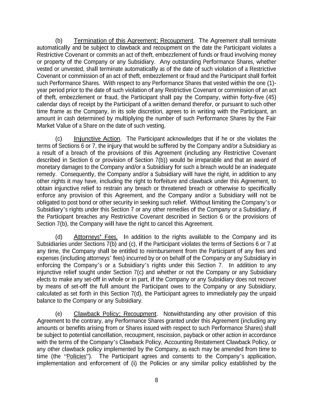 8(b)本协议的终止;补偿。协议应自动终止,并在参与者违反限制性契约或实施涉及公司或任何子公司的金钱或财产的盗窃、挪用资金或欺诈行为之日进行追回和补偿。任何已发行的业绩股份,不论已归属或未归属,均应自违反限制性契约或实施盗窃、挪用或欺诈行为之日起自动终止,参与者应没收该等业绩股份。就任何在违反任何限制性公约或实施盗窃、贪污或欺诈行为的日期前一(1)年期间内归属的任何履约股份而言,参与者应在参与者收到有关的书面要求后的四十五(45)个日历日内,或根据公司全权酌情与参与者书面同意的其他时间范围,向公司支付,现金数额,以该等履约股份的数目乘以该等归属日股份的公平市场价值而厘定。(c)禁令行动。参与者承认,如果他或她违反第6或7条的条款,公司和/或子公司因违反本协议条款(包括第6条或第7(b)条条款中所述的任何限制性公约)而遭受的损害将是不可弥补的,并且就此种违约行为向公司和/或子公司判给金钱损害赔偿将是不充分的补救措施。因此,公司及/或附属公司除根据本协议可能拥有的任何其他权利(包括没收及追回权利)外,将有权获得禁令救济以约束任何违约或威胁违约或以其他方式具体强制执行本协议的任何条款,而公司及/或附属公司将无义务在寻求该等救济时提供保证金或其他担保。在不限制公司或附属公司在本第7条下的权利或公司或附属公司的任何其他补救措施的情况下,如果参与者违反第6条所述的任何限制性契约或第7(b)条的规定,公司将有权取消本协议。(d)律师费。除公司及其附属公司根据第7(b)及(c)条可享有的权利外,如参与者在任何时间违反第6或7条的条款,公司有权向参与者偿付公司或任何附属公司或其代表在执行公司或附属公司根据本条第7条享有的权利时所招致的任何费用及开支(包括律师费)。除了根据第7(c)条寻求的任何强制性救济以及无论公司或任何附属公司是否选择全部或部分作出任何抵销外,如果公司或任何附属公司没有通过抵销方式收回参与者欠公司或任何附属公司的全部款项(按本条第7(d)条规定计算),参与者同意立即向公司或任何附属公司支付未付余额。(e)追回政策;追偿。尽管本协议另有相反规定,根据本协议授出的任何履约股份(包括因该等履约股份而产生的任何金额或利益或就该等履约股份而发行的股份)须根据公司的追回政策、会计重述追回政策或公司实施的任何其他追回政策的条款进行潜在的注销、补偿、撤销、偿还或其他行动,每项政策均可不时修订(“政策”)。参与者同意并同意公司应用、实施和执行(i)政策或任何类似政策由