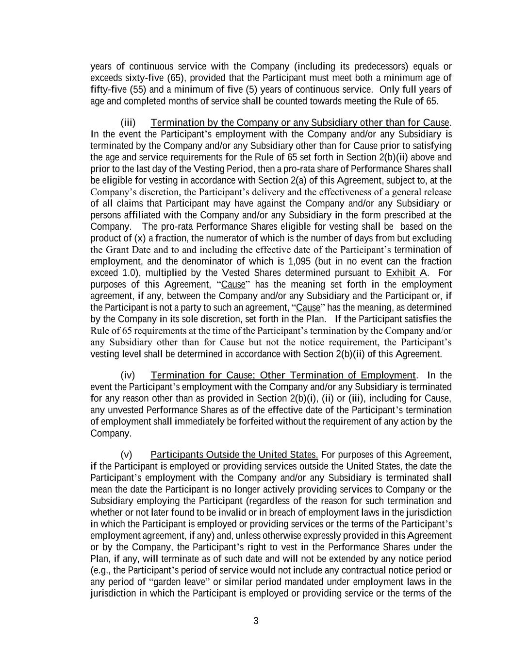 在公司(包括其前身)连续服务3年等于或超过六十五(65)年,条件是参与者必须同时满足五十五(55)岁的最低年龄和至少五(5)年的连续服务。只有满周岁和服务满月数才算符合65规则。(iii)由公司或任何非因故附属公司终止。若参与者在满足上述第2(b)(ii)条所述的年龄和服务要求之前且在授予期的最后一天之前被公司和/或任何子公司非因故终止与公司和/或任何子公司的雇佣关系,则按比例分配的履约股份将有资格根据本协议第2(a)条归属,但须由公司酌情决定,参与者的交付以及参与者可能以公司规定的形式对公司和/或任何子公司或与公司和/或任何子公司有关联的人提出的所有索赔的一般解除效力。符合归属条件的按比例履约股份应基于(x)a零头的乘积,其分子为自但不包括授予日起至参与者终止雇佣生效日期(含)的天数,其分母为1,095(但在任何情况下该零头均不得超过1.0),乘以根据附件 A确定的已归属股份。就本协议而言,“因”具有公司和/或任何子公司与参与者之间的雇佣协议(如有)中规定的含义,或,如果参与者不是此类协议的一方,则“原因”具有计划中规定的由公司全权酌情确定的含义。如果参与者在参与者被公司和/或非因故而非通知要求的任何子公司终止时满足规则65的要求,则参与者的归属水平应根据本协议第2(b)(ii)节确定。(四)因故终止雇佣关系;其他终止雇佣关系。如果参与者因第2(b)(i)、(ii)或(iii)条规定以外的任何原因(包括出于原因)而终止与公司和/或任何子公司的雇佣关系,则自参与者终止雇佣生效之日起的任何未归属业绩股份将立即被没收,而无需公司采取任何行动。(五)美国境外的参与者。就本协议而言,如参与者在美国境外受雇或提供服务,则该参与者在公司和/或任何子公司的受雇终止之日,系指该参与者不再积极向公司或雇用该参与者的子公司提供服务之日(无论该终止的原因如何,以及无论后来是否被认定为无效或违反参与者受雇或提供服务的司法管辖区的就业法或参与者的雇佣协议条款(如有),以及,除非本协议或公司另有明文规定,参与者根据计划归属于履约股份的权利(如有)将自该日期起终止,且不会因任何通知期而延长(例如,参与者的服务期将不包括任何合同通知期或任何“游园假”期或参与者受雇或提供服务的司法管辖区的就业法规定的类似期限或条款
