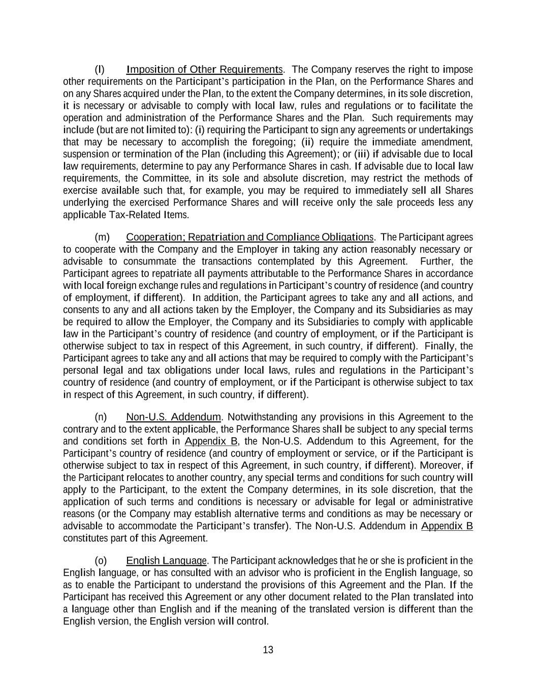 13(l)强加其他要求。公司保留对参与者参与计划、履约股份和根据计划获得的任何股份施加其他要求的权利,但以公司全权酌情确定遵守当地法律、规则和法规或便利履约股份和计划的运营和管理为必要或可取的为限。此类要求可能包括(但不限于):(i)要求参与者签署为实现上述目标可能需要的任何协议或承诺;(ii)要求立即修改、暂停或终止计划(包括本协议);或(iii)如果因当地法律要求而可行,决定以现金支付任何履约股份。如果由于当地法律要求而可取,委员会可全权酌情限制可用的行使方法,例如,您可能被要求立即出售已行使的业绩股份的所有基础股份,并且将只收到出售收益减去任何适用的与税收相关的项目。(m)合作;遣返和遵守义务。参与者同意与公司和雇主合作,采取任何合理必要或可取的行动,以完成本协议所设想的交易。此外,参与者同意根据参与者居住国(以及就业国家,如果不同)的当地外汇规则和规定,汇回所有可归属于业绩份额的款项。此外,参与者同意采取任何和所有行动,并同意雇主、公司及其子公司可能需要采取的任何和所有行动,以允许雇主、公司及其子公司遵守参与者居住国(和就业国)的适用法律,或者如果参与者因本协议而在该国家(如果不同)以其他方式需缴税。最后,参与者同意采取任何和所有可能需要采取的行动,以遵守参与者居住国(和就业国)当地法律、规则和条例规定的参与者的个人法律和税收义务,或者如果参与者因本协议而需要在其他方面缴税,则在该国家(如果不同)。(n)非美国增编。尽管本协议中有任何相反的规定并在适用的范围内,履约股份应受本协议的非美国增编附录B中规定的任何特殊条款和条件的约束,对于参与者的居住国(以及就业或服务的国家,或者如果参与者因本协议而在其他方面需缴税,则在该国家(如果不同)。此外,如果参与者迁移到另一个国家,则该国家的任何特殊条款和条件将适用于参与者,但前提是公司自行决定,由于法律或行政原因,适用这些条款和条件是必要的或可取的(或公司可制定可能必要或可取的替代条款和条件,以适应参与者的转移)。附录B中的非美国增编构成本协议的一部分。(o)英语。参与者承认自己精通英语,或咨询过精通英语的顾问,以使参与者理解本协议和计划的规定。如参与者已收到本协议或与计划有关的任何其他文件,并已翻译成英文以外的语文,且若翻译版本的含义与英文版本不同,则由英文版本控制。