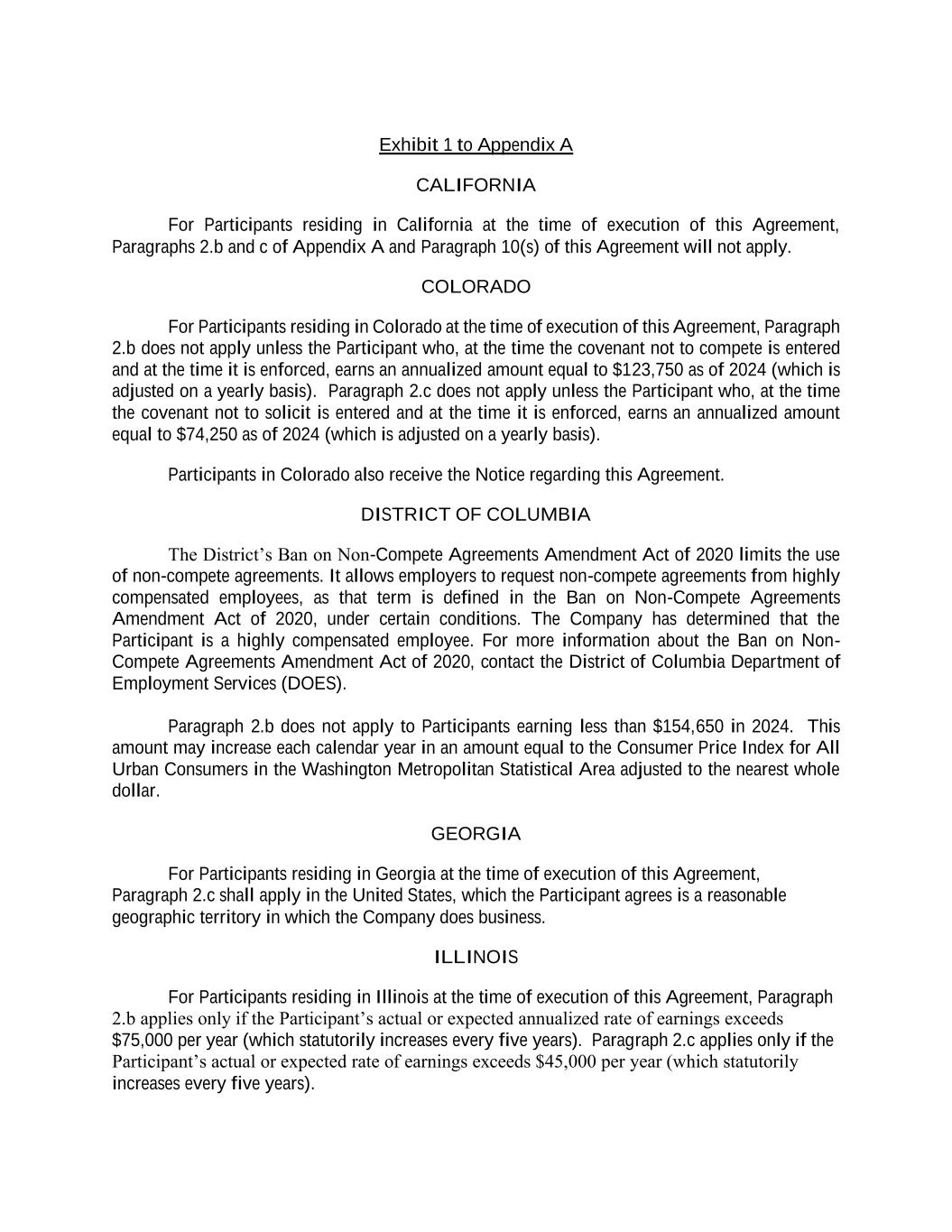 对于本协议执行时居住在加利福尼亚州的参与者,附录A加利福尼亚州的附件 1,附录A的2.b和c段以及本协议的第10(s)段将不适用。COLORADO对于本协议执行时居住在科罗拉多州的参与者,第2.b款不适用,除非参与者在订立不竞争盟约时和执行时,截至2024年的年化金额等于123,750美元(按年调整)。2.c款不适用,除非参与者在订立不征求盟约和执行盟约时,截至2024年的年化收入相当于74,250美元(按年调整)。科罗拉多州的参与者也会收到有关此协议的通知。哥伦比亚特区2020年区禁止非竞争协议修正案法案限制了非竞争协议的使用。它允许雇主在特定条件下向高薪雇员请求竞业禁止协议,该术语在2020年《禁止竞业禁止协议修正案》中定义。公司已确定该参与者为高薪员工。有关2020年禁止非竞争性协议修正法案的更多信息,请联系哥伦比亚特区就业服务部(DOES)。2.b款不适用于2024年收入低于154650美元的参与者。该金额可能会在每个日历年增加,金额等于华盛顿都市统计区所有城市消费者的消费价格指数调整为最接近的整美元。GEORGIA对于本协议执行时居住在格鲁吉亚的参与者,第2.c款应适用于美国,参与者同意美国是公司开展业务的合理地理区域。ILINOIS对于本协议执行时居住在伊利诺伊州的参与者,只有当参与者的实际或预期年化收益率超过每年75000美元(法定每五年增加一次)时,才适用第2.b款。2.c款仅适用于参与者的实际或预期收益率超过每年45000美元(法定每五年增加一次)的情况。