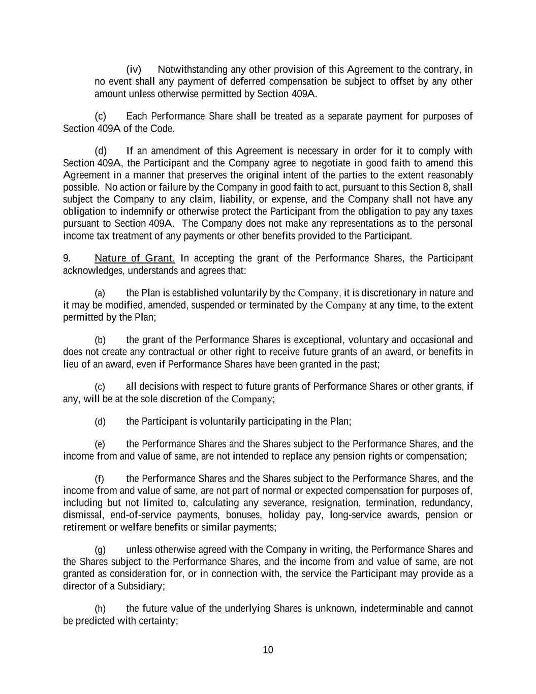 10(iv)尽管本协议另有相反规定,除非第409A条另有许可,否则在任何情况下,任何递延补偿的支付均不得被任何其他数额抵消。(c)就《守则》第409A条而言,每一履约份额应被视为一笔单独的付款。(d)如有必要修订本协议以使其符合第409A条,则参与者和公司同意本着诚意进行谈判,以在合理可能的范围内保持各方的原意的方式修订本协议。公司根据第8条善意行事的任何行动或不作为,均不得使公司受到任何申索、法律责任或费用,而公司并无任何义务根据第409A条赔偿或以其他方式保护参与者免于支付任何税款的义务。公司不对向参与者提供的任何付款或其他福利的个人所得税处理作出任何陈述。9.格兰特的性质。在接受授予绩效股份时,参与者承认、理解并同意:(a)该计划由公司自愿设立,其性质为酌情决定,公司可在计划允许的范围内随时对其进行修改、修订、暂停或终止;(b)绩效股份的授予是例外的、自愿的和偶发的,并且不会产生任何合同或其他权利来获得未来授予的奖励,或代替奖励的利益,即使过去已授出绩效股份;(c)有关未来授予绩效股份或其他授予(如有)的所有决定将由公司全权酌情决定;(d)参与者自愿参与计划;(e)绩效股份及受绩效股份规限的股份,以及来自该等股份的收入及价值,均无意取代任何退休金权利或补偿;(f)绩效股份及受绩效股份规限的股份,以及来自该等股份的收入及价值,并非正常或预期补偿的一部分,其目的包括但不限于计算任何遣散费、辞职费、解雇费、裁员、解雇、服务终止费、奖金、假期工资、长期服务奖励、退休金或退休金或福利福利或类似付款;(g)除非与公司另有书面协议,否则业绩股份及业绩股份受规限的股份,以及来自该等股份的收入及价值,不会作为参与者作为附属公司董事可能提供的服务的代价或与之有关;(h)相关股份的未来价值未知,无法确定,无法确定地预测;