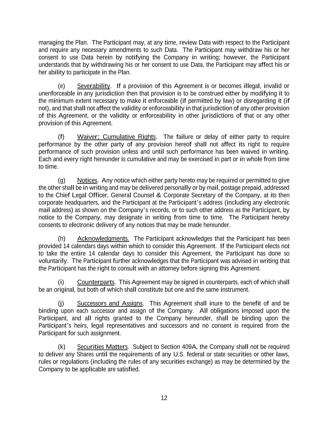 12管理计划。参与者可随时审查与参与者相关的数据,并要求对此类数据进行任何必要的修改。参与者可以通过书面通知公司的方式撤回其在此使用Data的同意;但是,参与者了解到,通过撤回其使用Data的同意,参与者可能会影响其参与计划的能力。(e)可分割性。如果本协议的一项规定在任何司法管辖区是或成为非法、无效或不可执行的,则该规定应通过将其修改至使其可执行(如果法律允许)或无视(如果不是)所需的最低限度来解释,并且不影响本协议的任何其他规定在该司法管辖区的有效性或可执行性,或该规定或本协议的任何其他规定在其他司法管辖区的有效性或可执行性。(f)放弃;累积权利。任何一方未能或延迟要求另一方履行本协议的任何规定,不影响其要求履行该规定的权利,除非且直至该履行已被书面放弃。本协议项下的每项权利均为累积性的,可不时部分或全部行使。(g)通知。任何一方可能被要求或被允许给予另一方的任何通知,均应以书面形式送达,并可亲自送达或以邮寄方式、预付邮资的方式送达公司当时的公司总部的首席法务官、总法律顾问和公司秘书,以及在公司记录上显示的参与者地址(包括任何电子邮件地址)的参与者,或通过向公司发出的通知不时以书面形式指定的参与者的其他地址。参与者特此同意以电子方式交付根据本协议可能发出的任何通知。(h)致谢。参与者承认,已向参与者提供了14个日历日,可在其中考虑本协议。如果参与者选择不花整个14个日历天来考虑本协议,则参与者自愿这样做。参与者进一步承认,参与者被书面告知,参与者有权在签署本协议之前咨询律师。(i)对应方。本协议可以对应方签署,每份协议应为正本,但两者应仅构成一份相同的文书。(j)继任人和受让人。本协议应对公司的每一位继任者和受让人有利,并对其具有约束力。对参与者施加的所有义务,以及根据本协议授予公司的所有权利,均对参与者的继承人、法定代表人和继承人具有约束力,且此类转让无需获得参与者的同意。(k)证券事项。在符合第409A条的规定下,在满足任何美国联邦或州证券或公司确定适用的其他法律、规则或条例(包括任何证券交易所的规则)的要求之前,公司不得被要求交付任何股份。