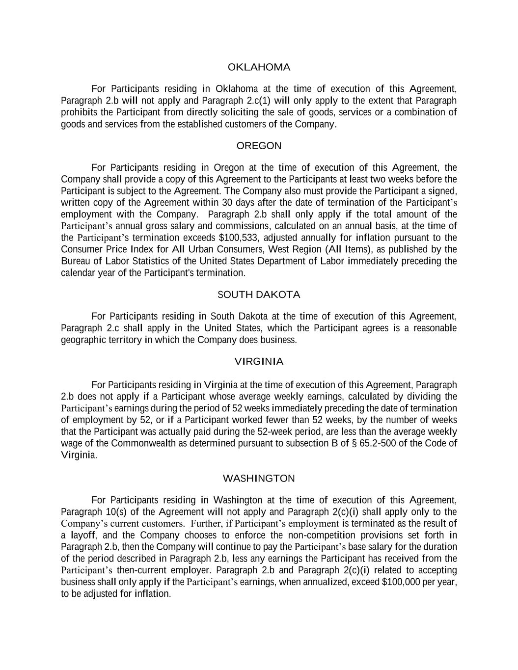 OKLAHOMA对于本协议执行时居住在俄克拉何马州的参与者,第2.b款将不适用,第2.c(1)款将仅在该款禁止参与者直接向公司的既定客户招揽商品、服务或商品和服务的组合销售的范围内适用。OREGON对于本协议执行时居住在俄勒冈州的参与者,公司应在参与者受协议约束的至少两周前向参与者提供本协议的副本。公司还必须在参与者与公司的雇佣关系终止之日后30天内向参与者提供经签署的书面协议副本。2.b款仅适用于参与者终止时按年度计算的年薪金毛额和佣金总额超过100,533美元,并根据紧接参与者终止日历年之前的美国劳工部劳工统计局公布的西部地区所有城市消费者消费价格指数(所有项目)每年根据通货膨胀进行调整的情况。南达科他州对于本协议执行时居住在南达科他州的参与者,第2.c款应适用于美国,参与者同意美国是公司开展业务的合理地理区域。对于本协议执行时居住在弗吉尼亚州的参与者,如果参与者的平均每周收入(按紧接终止雇佣日期前52周期间的参与者收入除以52计算),或者如果参与者的工作时间少于52周,则按该参与者在52周期间实际获得报酬的周数计算,低于根据《弗吉尼亚法典》第65.2-500条B款确定的联邦平均每周工资,则第2.b款不适用。华盛顿对于本协议执行时居住在华盛顿的参与者,协议第10(s)款将不适用,第2(c)(i)款仅适用于公司目前的客户。此外,如果由于裁员而终止了参与者的雇用,而公司选择执行第2.b款规定的竞业禁止条款,那么公司将继续支付参与者在第2.b款所述期间的基本工资,减去参与者从参与者当时的雇主那里获得的任何收入。与接受业务有关的第2.b款和第2款(c)项(i)项仅适用于参与者的收入按年计算超过每年10万美元并经通货膨胀调整的情况。