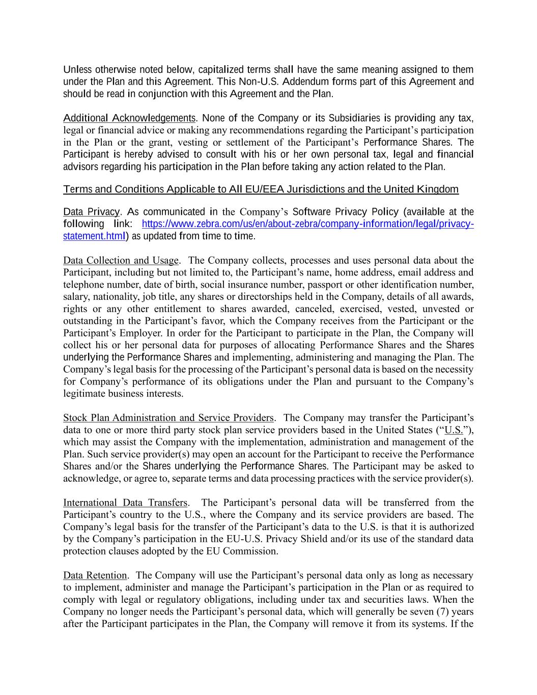 除非下文另有说明,大写术语应具有根据本计划和本协议赋予它们的相同含义。本非美国增编构成本协定的一部分,应与本协定和本计划一并阅读。额外致谢。本公司或其附属公司概无就参与者参与计划或参与者业绩股份的授予、归属或结算提供任何税务、法律或财务建议或作出任何建议。兹建议参与者在采取与该计划相关的任何行动之前,就其参与该计划的情况咨询其自己的个人税务、法律和财务顾问。适用于所有欧盟/欧洲经济区司法管辖区和英国数据隐私的条款和条件。正如公司不时更新的软件隐私政策(可在以下链接获得:https://www.zebra.com/us/en/about-zebra/company-information/legal/privacy-statement.html)中所传达的那样。数据收集和使用。公司收集、处理和使用有关参与者的个人资料,包括但不限于参与者的姓名、家庭住址、电子邮件地址和电话号码、出生日期、社会保险号码、护照或其他身份号码、工资、国籍、职务、在公司持有的任何股份或董事职位、公司从参与者或参与者的雇主收到的所有奖励、权利或对参与者有利的已授予、注销、行使、归属、未归属或未归属的股份的任何其他权利的详细信息。为使参与者参与该计划,公司将收集其个人资料,以分配业绩股份和业绩股份的基础股份以及实施、管理和管理该计划。公司处理参与者个人数据的法律依据是基于公司履行计划义务的必要性,并根据公司的合法商业利益。股票计划管理和服务提供商。公司可将参与者的数据转让给一家或多家位于美国(“美国”)的第三方股票计划服务提供商,后者可协助公司实施、管理和管理该计划。此类服务提供商可为参与者开立账户,以接收履约股份和/或履约股份的基础股份。可能会要求参与者承认或同意与服务提供商(s)分开的条款和数据处理做法。国际数据转让。参与者的个人数据将从参与者的国家转移到公司及其服务提供商所在的美国。公司将参与者的数据转移到美国的法律依据是,它是由公司参与欧盟-美国的授权。隐私盾和/或其使用欧盟委员会采用的标准数据保护条款。数据保留。公司将仅在实施、管理和管理参与者参与计划所需或根据要求遵守法律或监管义务(包括税法和证券法)时使用参与者的个人数据。当公司不再需要参与者的个人数据时,一般将在参与者参与计划七(7)年后,公司将从其系统中删除。如果