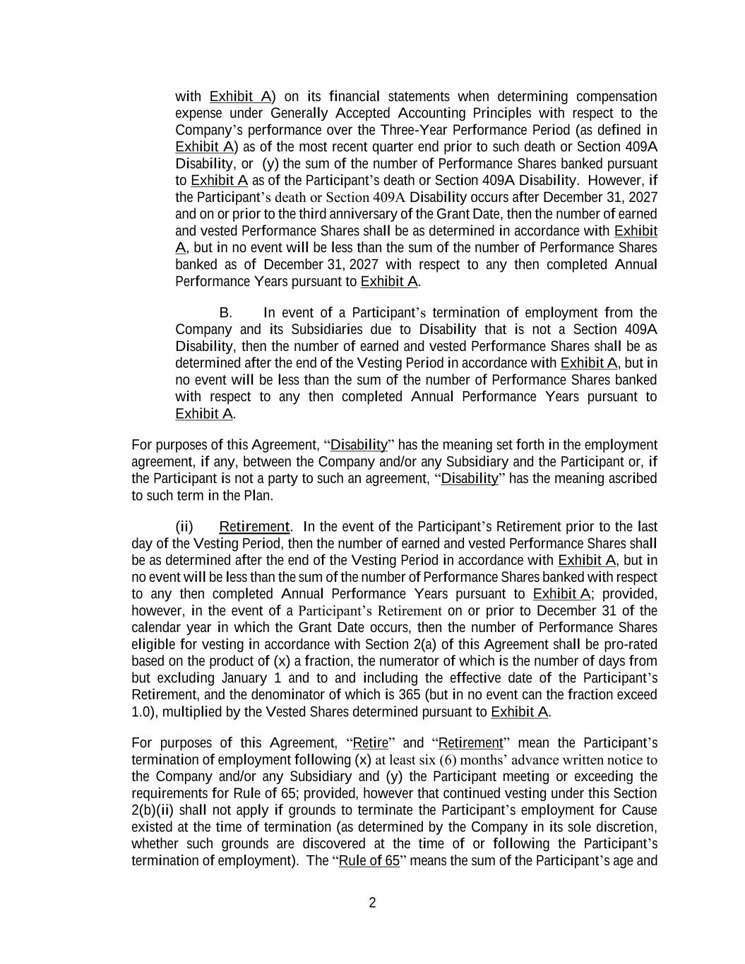 2连同附件 A)在其财务报表上确定根据公认会计原则就截至此类死亡或第409A条残疾之前的最近一个季度末的公司在三年业绩期间(定义见附件 A)的业绩支付的补偿费用时,或(y)截至参与者死亡或第409A条残疾时根据附件 A存入银行的业绩份额数量之和。但是,如果参与者的死亡或第409A条残疾发生在2027年12月31日之后且在授予日的第三个周年日或之前,则已赚取和已归属的绩效份额的数量应根据附件 A确定,但在任何情况下均不低于截至12月31日已存入银行的绩效份额数量之和,2027就任何当时根据附件 A.B.已完成的年度业绩年度而言。如果参与者因非第409A条残疾而终止与公司及其子公司的雇佣关系,则所赚取和归属的业绩份额的数量应根据TERMA在授予期归属期结束后确定,但在任何情况下均不会低于根据本协议的附件 A就任何当时已完成的年度业绩年度存入银行的业绩份额数量之和,“残疾”具有公司和/或任何子公司与参与者之间的雇佣协议(如有)中规定的含义,或者,如果参与者不是此类协议的一方,则“残疾”具有计划中该术语所赋予的含义。(二)退休。如果参与者在授予期的最后一天之前退休,则已赚取和已归属的业绩份额的数量应为在授予期结束后根据TERMA确定,但在任何情况下均不低于根据附件 A就任何当时已完成的年度业绩年度存入银行的业绩份额数量的总和;但是,如果参与者在授予日发生的日历年度的12月31日或之前退休,则根据本协议第2节(a)项符合归属条件的履约股份数量,根据(x)a分数的乘积按比例分配,该分数的分子为自但不包括1月1日起至参与者退休生效日期(包括该日期)的天数,分母为365(但在任何情况下该分数均不得超过1.0),乘以根据附件 A确定的已归属股份,就本协议而言,“退休”和“退休”是指参与者在(x)至少提前六(6)个月向公司和/或任何子公司发出书面通知和(y)参与者达到或超过第65条规则的要求后终止雇佣关系;但前提是,如果在终止时存在因故终止参与者雇佣的理由(由公司自行决定,无论这些理由是在参与者终止雇佣时或之后发现的),则根据本条第2(b)(ii)款继续归属不适用。“65岁规则”是指参与者的年龄和