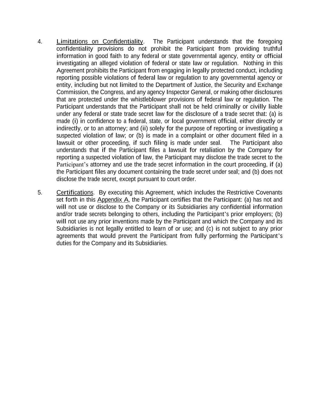 4.对保密的限制。参与者了解,上述保密条款并不禁止参与者向调查涉嫌违反联邦或州法律或法规的任何联邦或州政府机构、实体或官员善意提供真实信息。本协议不禁止参与者从事受法律保护的行为,包括向任何政府机构或实体报告可能违反联邦法律或法规的行为,包括但不限于司法部、安全和交易委员会、国会和任何机构监察长,或进行受联邦法律或法规举报人条款保护的其他披露。参与者理解,根据任何联邦或州商业秘密法,参与者不应因以下情况而被追究刑事或民事责任:(a)是(i)直接或间接地向联邦、州或地方政府官员或向律师秘密作出的;(ii)仅为报告或调查涉嫌违法的目的;或(b)是在诉讼或其他程序中提交的投诉或其他文件中作出的,如果此类提交是盖章的。参与者还了解,如果参与者因举报涉嫌违法而提起诉讼要求公司进行报复,参与者可以向参与者的代理律师披露商业秘密,并在法院程序中使用商业秘密信息,如果(a)参与者将任何包含该商业秘密的文件加盖印章;以及(b)不披露该商业秘密,除非根据法院命令。5.认证。参与者通过执行本协议,其中包括本附录A中规定的限制性契约,证明参与者:(a)没有也不会使用或向公司或其子公司披露属于他人的任何机密信息和/或商业秘密,包括参与者的先前雇主;(b)将不会使用参与者作出的任何公司及其附属公司在法律上无权获悉或使用的先前发明;及(c)不受任何会妨碍参与者为公司及其附属公司充分履行参与者职责的先前协议的约束。