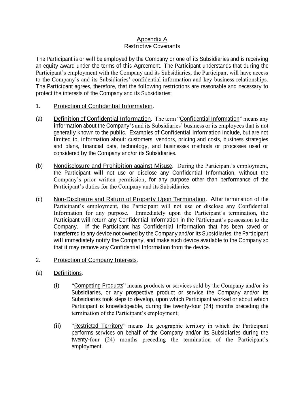 附录A限制性契约参与者目前或将受雇于公司或其子公司之一,并正在根据本协议的条款获得股权奖励。参与者了解,在参与者受雇于公司及其子公司期间,参与者将可以访问公司及其子公司的机密信息和关键业务关系。参与者同意,因此,为保护公司及其子公司的利益,以下限制是合理和必要的:1。保护机密信息。(a)机密信息的定义。保密资料一词是指任何有关公司及其附属公司的业务或其雇员的资料,而这些资料一般不为公众所知。机密信息的例子包括但不限于有关以下方面的信息:客户、供应商、定价和成本、业务战略和计划、财务数据、技术以及公司和/或其子公司使用或考虑的业务方法或流程。(b)不披露和禁止滥用。在参与者受雇期间,未经公司事先书面许可,参与者不会出于除为公司及其子公司履行参与者职责以外的任何目的使用或披露任何机密信息。(c)终止时不披露和返还财产。终止参与者的雇佣后,参与者不会出于任何目的使用或披露任何机密信息。在参与者终止后,参与者将立即将参与者拥有的任何机密信息退还公司。如果参与者有已保存或转移到任何非公司和/或其子公司拥有的设备的机密信息,参与者将立即通知公司,并向公司提供该设备,以便其可以从设备中删除任何机密信息。2.保护公司利益。(a)定义。(i)“竞争产品”是指公司和/或其子公司在终止聘用前二十四(24)个月内销售的产品或服务,或公司和/或其子公司采取步骤开发的任何预期产品或服务,参与者曾在这些产品或服务上工作或参与者对其有所了解;(ii)“受限区域”是指参与者在终止聘用前二十四(24)个月内代表公司和/或其子公司提供服务的地理区域。