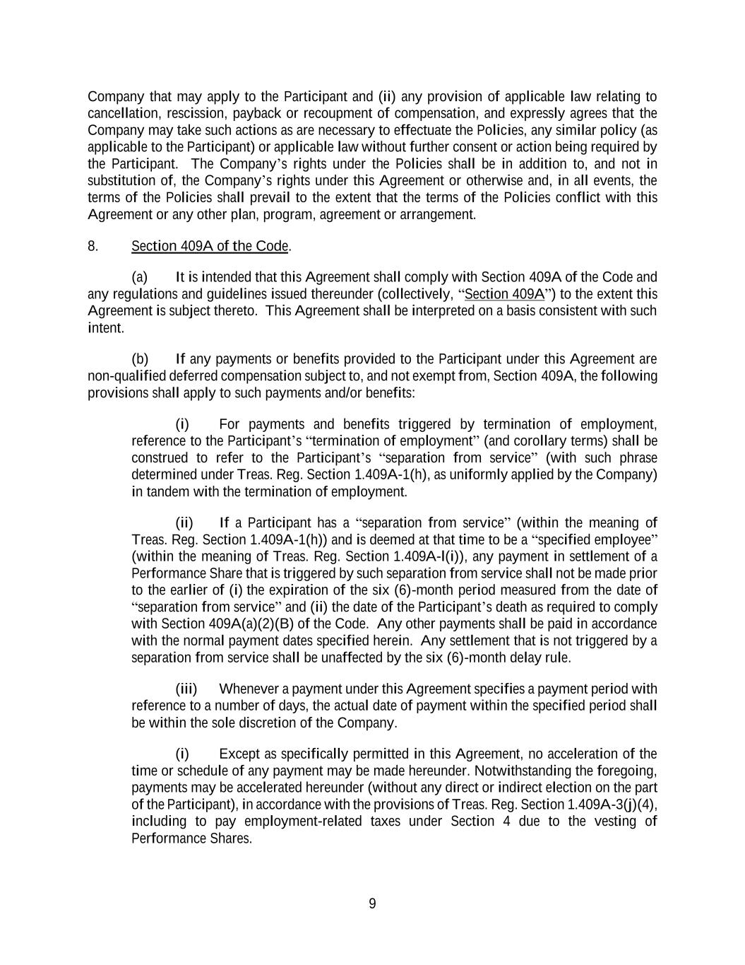 9可向参与者适用的公司及(ii)与取消、撤销、偿还或补偿有关的任何适用法律条文,并明确同意公司可采取必要行动以执行政策、任何类似政策(如适用于参与者)或适用法律,而无须参与者进一步同意或采取要求的行动。公司在保单下的权利应是公司在本协议或其他协议下的权利的补充,而不是替代,并且在任何情况下,只要保单的条款与本协议或任何其他计划、计划、协议或安排发生冲突,则应以保单的条款为准。8.守则第409a条。(a)本协议拟在本协议受其约束的范围内遵守《守则》第409A条以及根据该条发布的任何条例和准则(统称“第409A条”)。本协议应在与此意图一致的基础上加以解释。(b)如果根据本协议向参与者提供的任何付款或福利属于非合格递延补偿,但须遵守且不豁免于第409A条,则以下规定应适用于此类付款和/或福利:(i)对于因终止雇佣而触发的付款和福利,提及参与者的“终止雇佣”(以及必然条款)应被解释为指参与者的“离职”(在Treas.Reg.第1.409A-1(h)条中确定的短语,由公司统一适用)与终止雇佣同时进行。(ii)如参与者有“离职”(在Treas.Reg.第1.409A-1(h)条的含义内),且当时被视为“特定雇员”(在Treas.Reg.第1.409A-l(i)条的含义内),则由该离职触发的任何结算绩效份额的付款,不得在(i)自“离职”之日起计算的六(6)个月期限届满和(ii)参与者死亡之日中较早者之前支付,以符合《守则》第409A(a)(2)(b)条的规定。任何其他款项应按照本协议规定的正常付款日期支付。任何未因离职离职而触发的结算,不受六(6)个月延迟规则的影响。(iii)凡根据本协议支付的款项参照若干天指明付款期,则在指定期间内的实际付款日期应由公司全权酌情决定。(i)除本协议特别许可外,不得根据本协议加速任何付款的时间或时间表。尽管有上述规定,根据Treas.Reg.第1.409A-3(j)(4)条的规定,可根据本协议加速付款(无需参与者进行任何直接或间接选择),包括根据第4条支付因业绩股份归属而产生的与就业相关的税款。