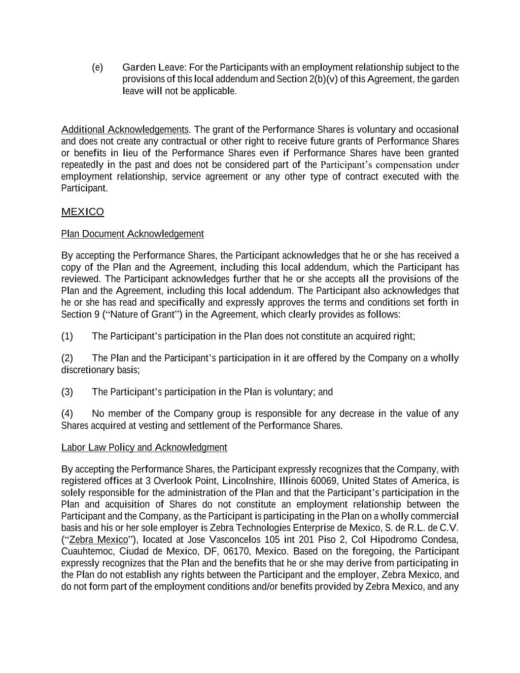 (e)园假:对于受本地方增编和本协议第2(b)(v)节规定的雇佣关系的参与者,园假将不适用。额外致谢。业绩股份的授出属自愿及偶发性,并不产生任何合约或其他权利以收取未来的业绩股份授出或利益以代替业绩股份,即使业绩股份过去曾多次授出,亦不被视为参与者根据雇佣关系、服务协议或与参与者签立的任何其他类型合约的补偿的一部分。墨西哥计划文件确认通过接受绩效份额,参与者确认他或她已收到计划和协议的副本,包括参与者审查过的这份当地增编。参与者进一步确认,他或她接受计划和协议的所有条款,包括本地方增编。参与者还承认,他或她已阅读并具体明确批准协议第9节(“授予性质”)中规定的条款和条件,其中明确规定:(1)参与者参与计划并不构成已获得的权利;(2)该计划和参与者参与计划由公司全权酌情提供;(3)参与者参与计划是自愿的;(4)公司集团的任何成员均不对在业绩股份归属和结算时所获得的任何股份的价值下降负责。劳动法政策和认可通过接受业绩份额,参与者明确承认注册办事处位于美利坚合众国伊利诺伊州林肯郡60069号3 Overlook Point的公司全权负责计划的管理,并且参与者参与计划和收购股份并不构成参与者与公司之间的雇佣关系,因为参与者以完全商业基础参与计划,其唯一雇主为斑马技术 Enterprise de Mexico,S. de R.L. de C.V.(“Zebra Mexico”),位于Jose Vasconcelos 105 int 201 Piso 2,Col Hipodromo Condesa,Cuauhtemoc,Ciudad de Mexico,DF,06170,Mexico。基于上述情况,参与者明确承认,该计划以及他或她可能从参与该计划中获得的福利并不在参与者与雇主Zebra Mexico之间确立任何权利,也不构成Zebra Mexico提供的就业条件和/或福利的一部分,以及任何