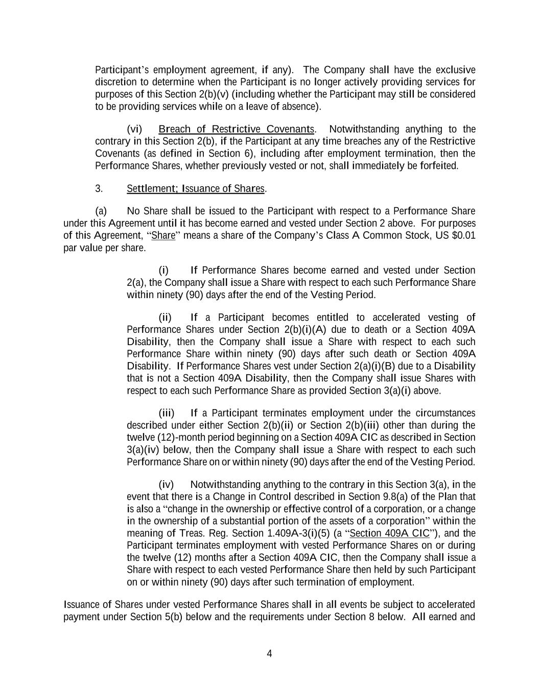 4参与者的就业协议(如有)。公司拥有专属酌情决定权,以决定参与者何时不再积极为本第2(b)(v)条的目的提供服务(包括参与者在休假期间是否仍可被视为提供服务)。(vi)违反限制性盟约。尽管本条第2(b)条另有相反规定,如参与者在任何时间违反任何限制性契约(如第6条所界定),包括在终止雇用后,则表现股份,不论先前是否已归属,均须立即被没收。3.结算;发行股份。(a)不得就本协议项下的履约份额向参与者发行任何份额,直至该份额根据上文第2条获得并归属。就本协议而言,“股份”是指公司A类普通股的一股,每股面值0.01美元。(i)倘业绩股份根据第2(a)条赚取及归属,公司须于授予期结束后九十(90)日内就每一该等业绩股份发行股份。(ii)如任何参与者因死亡或第409A条伤残而根据第2(b)(i)(a)条有权加速归属表现股份,则公司须在该死亡或第409A条伤残后九十(90)天内就每一该等表现股份发行股份。倘表现股份因并非第409A条残疾的残疾而根据第2(a)(i)(b)条归属,则公司须按上文第3(a)(i)条的规定就每一该等表现股份发行股份。(iii)如任何参与者在第2(b)(ii)条或第2(b)(iii)条所述的情况下终止雇佣,但在下文第3(a)(iv)条所述的自第409A条CIC开始的十二(12)个月期间内除外,则公司须于授予期结束后的九十(90)天内或就每一该等履约股份发行股份。(iv)尽管本第3(a)条另有相反规定,如计划第9.8(a)条所述的控制权变更亦属Treas所指的“公司的所有权或有效控制权的变更,或公司大部分资产的所有权的变更”,则在此情况下。Reg.第1.409A-3(i)(5)条(“第409A条中投”),且参与者于第409A条中投后十二(12)个月或期间以既得业绩股份终止雇佣,然后,公司应在该终止雇佣后的九十(90)天内或之后的九十(90)天内,就该参与者当时持有的每一股既得绩效股份发行一股股份。根据既得业绩股份发行的股份在所有情况下均须根据下文第5(b)节和下文第8节的要求进行加速支付。全部赚得和