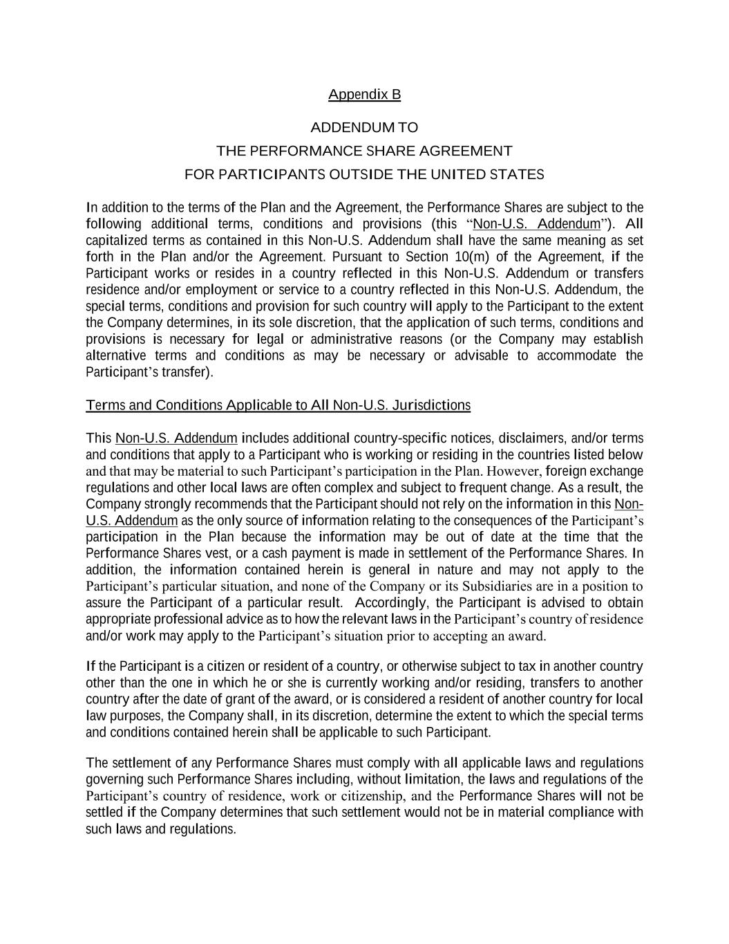 美国境外参与者履约份额协议附录B除计划和协议条款外,履约份额还受以下附加条款、条件和规定(本“非美国增编”)的约束。本非美国增编中包含的所有大写术语应具有计划和/或协议中规定的相同含义。根据该协议第10(m)节,如果参与者在本非美国增编所反映的国家工作或居住,或将居住和/或就业或服务转移到本非美国增编所反映的国家,则该国家的特殊条款、条件和规定将适用于参与者,前提是公司自行决定,由于法律或行政原因,适用此类条款、条件和规定是必要的(或公司可制定替代条款和条件,以适应参与者的转移)。适用于所有非美国司法管辖区的条款和条件本非美国增编包括适用于在下列国家工作或居住的参与者的额外国别通知、免责声明和/或条款和条件,这些条款和条件可能对该参与者参与计划具有重要意义。然而,外汇法规和其他地方法律往往很复杂,经常发生变化。因此,公司强烈建议参与者不应依赖本非美国增编中的信息作为与参与者参与计划的后果相关的唯一信息来源,因为在业绩股份归属时信息可能已过时,或在结算业绩股份时支付现金。此外,此处包含的信息属于一般性质,可能不适用于参与者的特定情况,公司或其子公司均无法向参与者保证特定结果。因此,建议参与者在接受裁决之前就参与者居住和/或工作国家的相关法律如何适用于参与者的情况获得适当的专业建议。如果参与者是一国的公民或居民,或在他或她目前工作和/或居住的国家以外的另一国以其他方式须缴税,在授予裁决之日后转移到另一国,或为当地法律目的被视为另一国的居民,公司应酌情确定本协议所载特殊条款和条件适用于该参与者的程度。任何履约股份的结算必须遵守管辖该等履约股份的所有适用法律法规,包括但不限于参与者的居住国、工作或公民身份的法律法规。如果公司确定该等结算将不符合该等法律法规,则履约股份将不会进行结算。