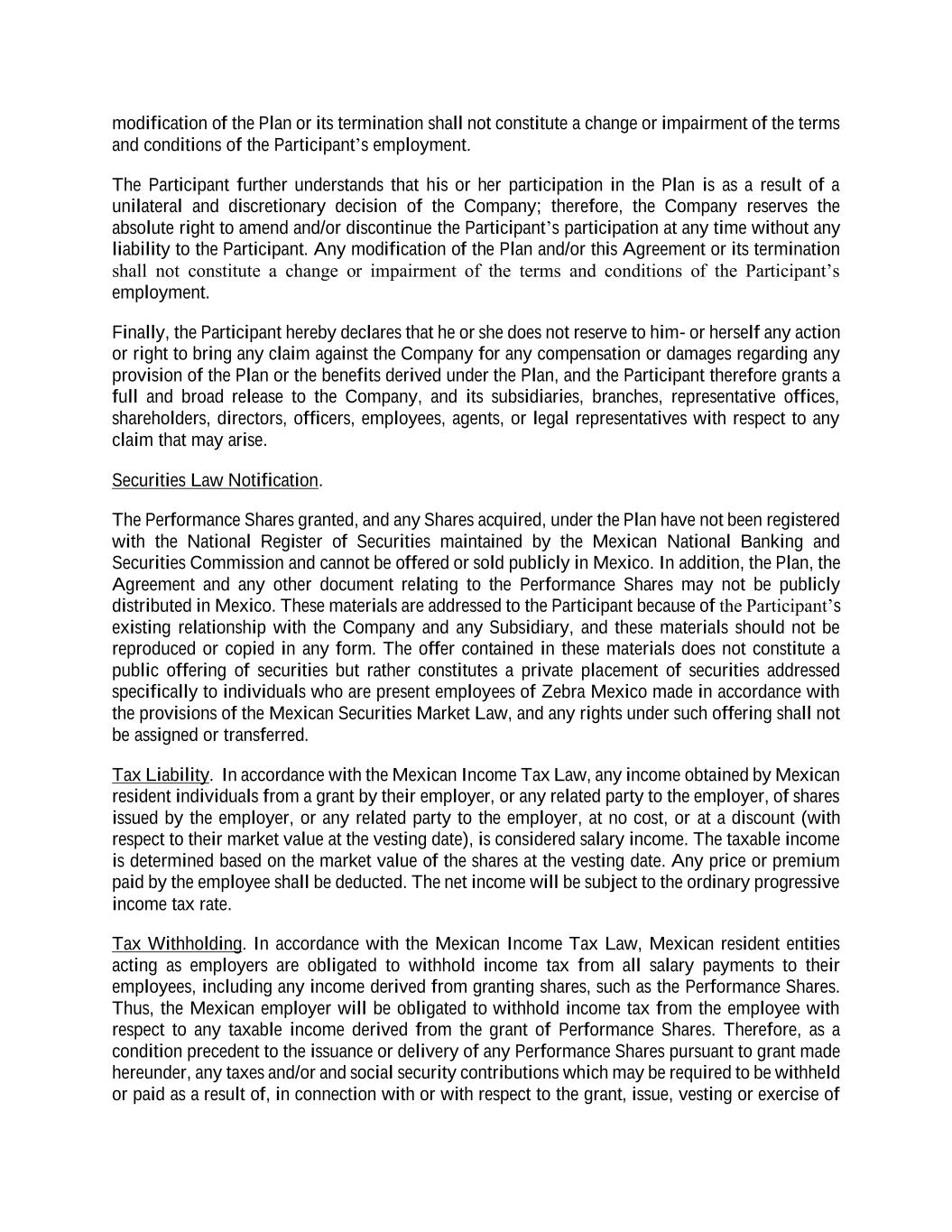 计划的修改或终止不应构成参与者受雇条款和条件的变更或损害。参与者进一步理解,他或她参与该计划是由于公司单方面和酌情决定的结果;因此,公司保留在任何时候修改和/或终止参与者参与的绝对权利,而不对参与者承担任何责任。计划和/或本协议的任何修改或终止均不构成对参与者雇佣条款和条件的变更或损害。最后,参与者在此声明,他或她本人不保留就计划的任何条款或根据计划产生的利益向公司提出任何赔偿或损害索赔的任何行动或权利,因此,参与者就可能产生的任何索赔向公司及其子公司、分支机构、代表处、股东、董事、高级职员、雇员、代理人或法定代表人授予全面和广泛的免责声明。证券法通告。根据该计划授予的业绩股份以及获得的任何股份尚未在墨西哥国家银行和证券委员会维护的国家证券登记册中登记,因此不能在墨西哥公开发售或出售。此外,该计划、该协议及与履约股份有关的任何其他文件不得在墨西哥公开分发。这些材料是由于参与者与公司和任何子公司的现有关系而发给参与者的,这些材料不应以任何形式复制或复制。这些材料中包含的要约并不构成公开发行证券,而是构成根据墨西哥证券市场法的规定作出的专门针对作为Zebra Mexico现有雇员的个人的证券私募,此类发行下的任何权利均不得转让或转让。税务责任。根据墨西哥所得税法,墨西哥居民个人从其雇主或雇主的任何关联方授予雇主或雇主的任何关联方发行的股份中免费或折价(相对于其在归属日的市场价值)获得的任何收入,均被视为工资收入。应纳税所得额根据股份在归属日的市场价值确定。职工支付的任何价款或保费,应予扣除。净收入将适用普通累进所得税率。扣税。根据墨西哥所得税法,作为雇主的墨西哥居民实体有义务从向其雇员支付的所有工资中预扣所得税,包括从授予股份中获得的任何收入,例如绩效股份。因此,墨西哥雇主将有义务就授予绩效股份所得的任何应税收入向雇员预扣所得税。因此,作为根据根据本协议作出的授予而发行或交付任何履约股份的先决条件,可能因授予、发行、归属或行使而被要求代扣代缴或支付的任何税款和/或社会保障缴款