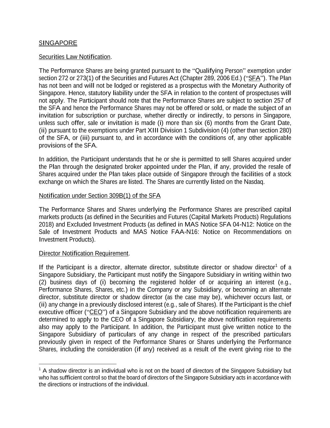 新加坡证券法通告。业绩股份是根据《证券和期货法》(2006年版第289章)(“SFA”)第272或273(1)条规定的“合格人员”豁免授予的。该计划没有也不会作为招股章程提交或注册于新加坡金融管理局。因此,SFA规定的与招股说明书内容相关的法定责任将不适用。参与者应注意,履约股份受证监会第257条规限,因此,履约股份不得直接或间接向新加坡人要约或出售,或作出认购或购买邀请的标的,除非该要约、出售或邀请是(i)自授出日期起超过六(6)个月作出,(ii)根据证监会第十三部第1分部第(4)款(第280条除外)项下的豁免作出,或(iii)根据及根据以下条件作出,SFA的任何其他适用条款。此外,参与者了解,他或她被允许通过根据该计划指定的指定经纪人(如有)出售根据该计划获得的股份,前提是根据该计划获得的股份的转售发生在新加坡境外,通过股份上市的证券交易所的设施进行。股票目前在纳斯达克上市。根据SFA第309B(1)条发出的通知业绩份额和业绩份额的基础份额是规定的资本市场产品(定义见《2018年证券和期货(资本市场产品)条例》)和排除投资产品(定义见MAS通知SFA 04-N12:关于销售投资产品的通知和MAS通知FAA-N16:关于投资产品推荐的通知)。董事通知规定。如果参与者是新加坡子公司的董事、候补董事、替代董事或影子董事1,则参与者必须在(i)成为公司或任何子公司的注册持有人或获得权益(例如,业绩股份、股份等),或成为候补董事、替代董事或影子董事(视情况而定)(以最后发生者为准)的两(2)个工作日内以书面通知新加坡子公司,或(ii)先前披露的权益的任何变化(例如,出售股份)。如果参与者是新加坡子公司的首席执行官(“CEO”),且上述通知要求被确定适用于新加坡子公司的首席执行官,则上述通知要求也可能适用于参与者。此外,参与者必须向新加坡子公司发出书面通知,说明先前就业绩股份或业绩股份相关股份所提供的规定详情的任何变更,包括因导致1的事件而收到的对价(如有)A影子董事是一名个人,他不是新加坡子公司的董事会成员,但拥有足够的控制权,因此新加坡子公司的董事会按照个人的指示或指示行事。