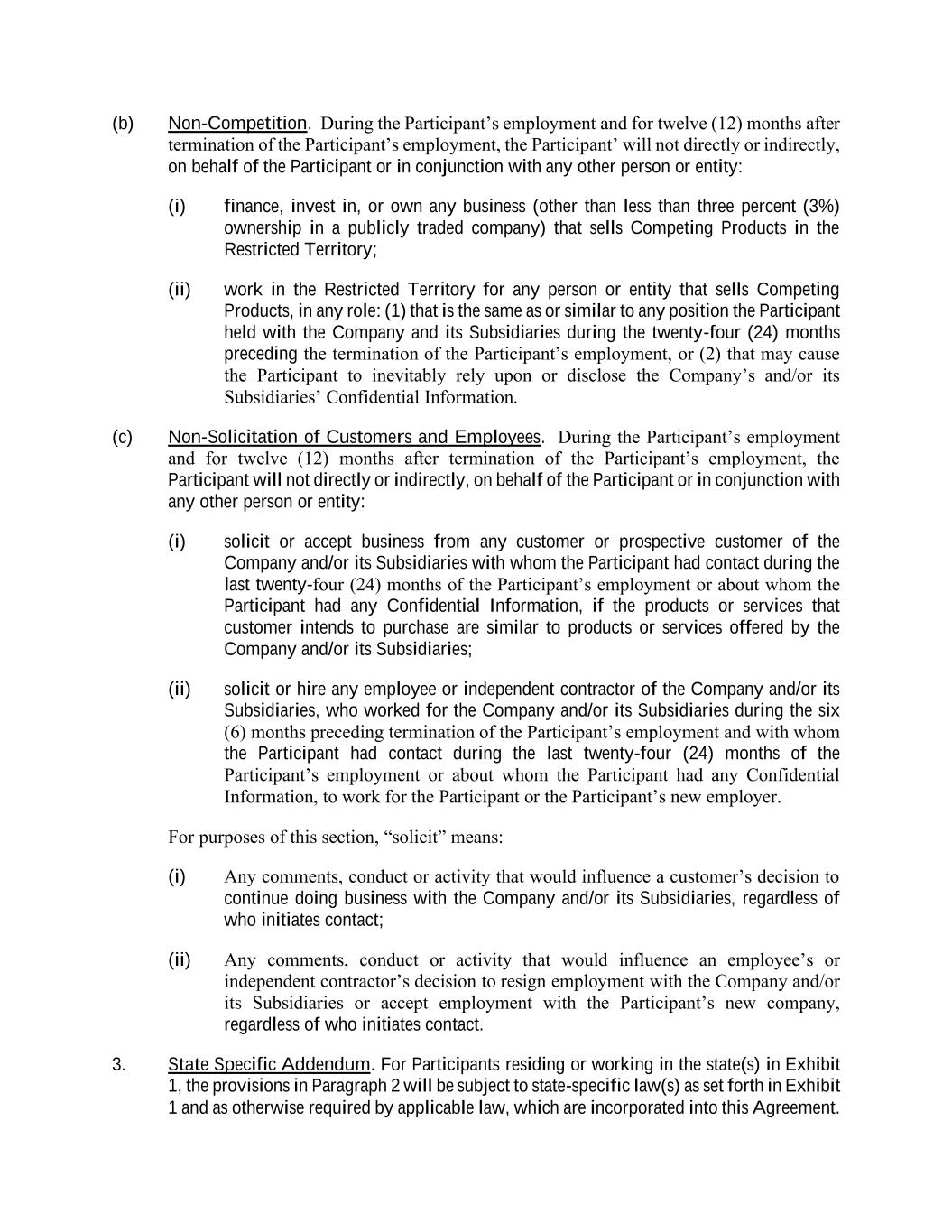 (b)不竞争。在参与者受雇期间以及在参与者受雇终止后的十二(12)个月内,参与者'将不会直接或间接代表参与者或与任何其他个人或实体:(i)为在受限区域内销售竞争产品的任何企业(上市公司的所有权少于百分之三(3%)除外)提供融资、投资或拥有该企业;(ii)为销售竞争产品的任何个人或实体在受限区域内工作,担任任何职务:(1)与参与者终止雇佣前二十四(24)个月内在公司及其子公司担任的任何职务相同或相似,或(2)可能导致参与者不可避免地依赖或披露公司和/或其子公司的机密信息。(c)不招揽客户和员工。在参与者受雇期间以及在参与者终止雇佣后的十二(12)个月内,参与者将不会直接或间接代表参与者或与任何其他个人或实体:(i)向参与者在其受雇的最后二十四(24)个月内与其有联系或参与者有任何机密信息的公司和/或其子公司的任何客户或潜在客户招揽或接受业务,如客户拟购买的产品或服务与公司及/或其附属公司所提供的产品或服务相似;(ii)招揽或雇用公司及/或其附属公司的任何雇员或独立承建商,他们在参与者的雇佣终止前六(6)个月内曾为公司及/或其附属公司工作,且在参与者受雇的最后二十四(24)个月内与该参与者有过接触或参与者有任何机密信息的人,为参与者或参与者的新雇主工作。就本节而言,“征求”是指:(i)会影响客户决定继续与公司和/或其子公司开展业务的任何评论、行为或活动,无论由谁发起联系;(ii)会影响员工或独立承包商决定辞去公司和/或其子公司的工作或接受参与者的新公司的工作的任何评论、行为或活动,无论由谁发起联系。3.州特定增编。对于在附件 1中居住或工作在(s)个州的参与者,第2款中的规定将受制于附件 1中规定的特定州的法律以及适用法律的其他要求,这些法律已纳入本协议。