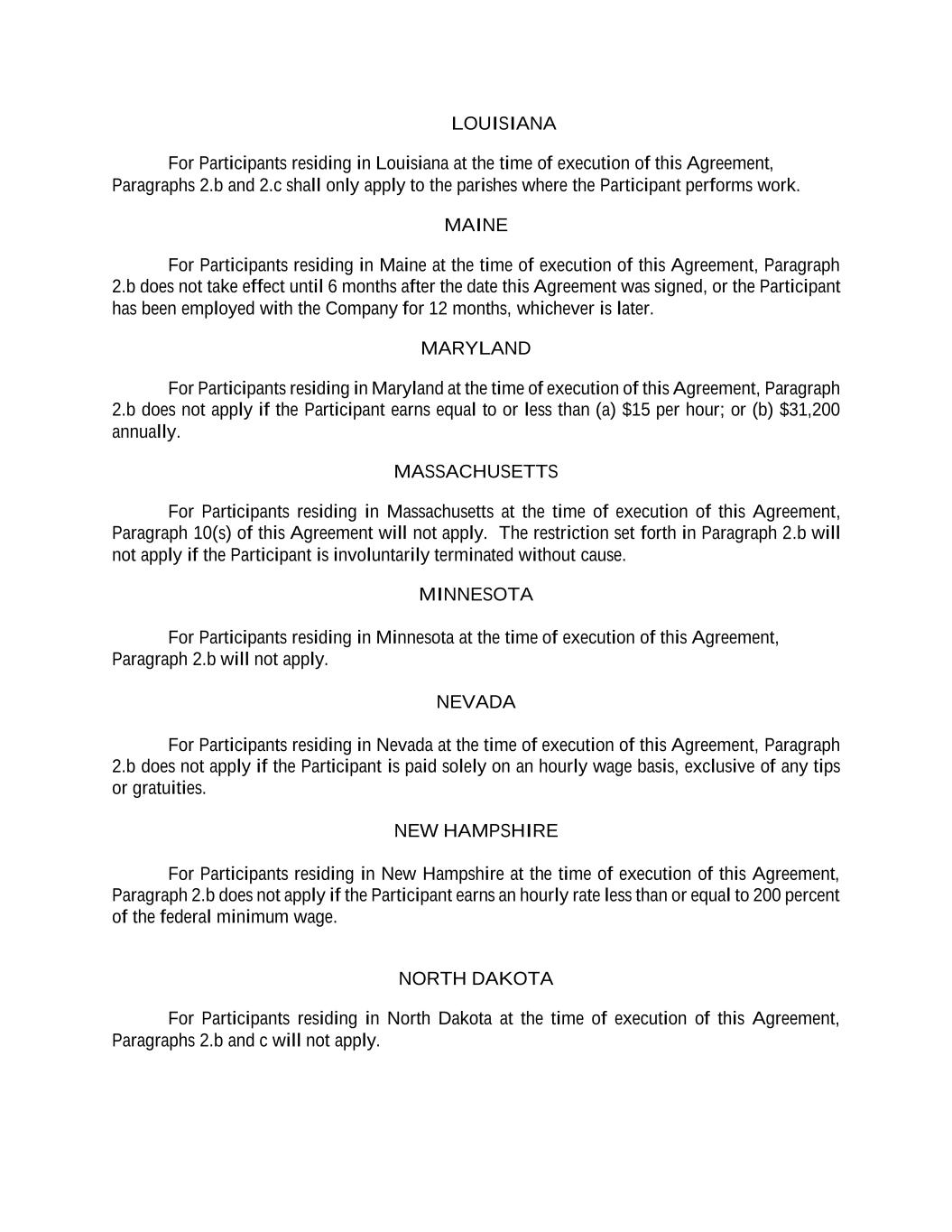 路易斯安那州对于本协议执行时居住在路易斯安那州的参与者,第2.b和2.c款仅适用于参与者执行工作的教区。MAINE对于本协议执行时居住在缅因州的参与者,第2.b款直到本协议签署之日起6个月后才生效,或参与者已在公司受雇12个月,以较晚者为准。马里兰州对于本协议执行时居住在马里兰州的参与者,如果参与者的收入等于或低于(a)每小时15美元;或(b)每年31,200美元,则第2.b款不适用。马萨诸塞州对于本协议执行时居住在马萨诸塞州的参与者,本协议第10(s)段将不适用。2.b款规定的限制,如果参与者无故被非自愿终止,则不适用。MINNESOTA对于本协议执行时居住在明尼苏达州的参与者,第2.b款将不适用。NEVADA对于本协议执行时居住在内华达州的参与者,如果参与者仅按小时工资支付,不包括任何小费或小费,则第2.b款不适用。对于本协议执行时居住在新罕布什尔州的参与者,如果参与者的小时工资低于或等于联邦最低工资的200%,则第2.b款不适用。北达科他州对于本协议执行时居住在北达科他州的参与者,第2.b和c款将不适用。