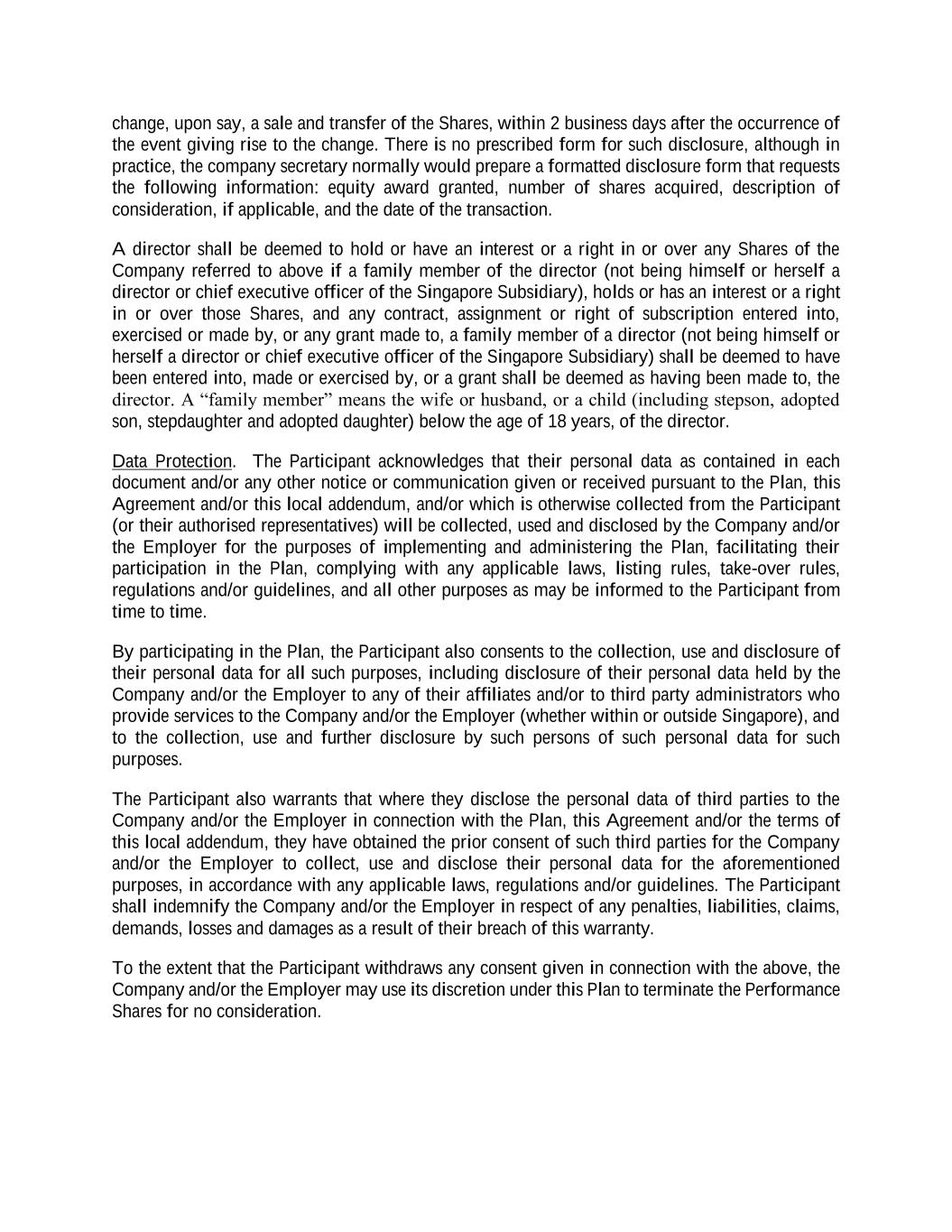 变更,如说,出售和转让股份,在引起变更的事件发生后2个工作日内。此类披露没有规定的表格,尽管在实践中,公司秘书通常会准备一份格式化的披露表格,要求提供以下信息:授予的股权奖励、获得的股份数量、对价描述(如适用)以及交易日期。如董事的家庭成员(其本人并非新加坡附属公司的董事或行政总裁)持有或拥有该等股份的权益或权利,以及订立、行使或作出的任何合约、转让或认购权,或向其作出的任何授予,则董事须被视为持有或拥有上述公司任何股份的权益或权利,董事的家庭成员(其本人并非新加坡附属公司的董事或首席执行官)应被视为由该董事订立、作出或行使,或应被视为已向该董事作出授予。“家庭成员”是指董事的妻子或丈夫,或18岁以下的子女(包括继子、养子、继女和养女)。数据保护。参与者确认,公司和/或雇主将收集、使用和披露根据计划、本协议和/或本当地增编提供或收到的每份文件和/或任何其他通知或通信中包含的个人数据,以及/或以其他方式从参与者(或其授权代表)处收集、使用和披露的数据,以用于实施和管理计划、便利其参与计划、遵守任何适用法律、上市规则、接管规则、法规和/或指南,以及可能不时告知参与者的所有其他目的。通过参与该计划,参与者还同意为所有此类目的收集、使用和披露其个人数据,包括将公司和/或雇主持有的其个人数据披露给其任何关联公司和/或向向公司和/或雇主提供服务的第三方管理人(无论是在新加坡境内还是境外),并同意这些人为此类目的收集、使用和进一步披露此类个人数据。参与者还保证,当他们向公司和/或雇主披露与计划、本协议和/或本当地增编条款有关的第三方的个人数据时,他们已根据任何适用的法律、法规和/或指南获得此类第三方的事先同意,以便公司和/或雇主为上述目的收集、使用和披露他们的个人数据。参与者应赔偿公司和/或雇主因违反本保证而导致的任何处罚、责任、索赔、要求、损失和损害。在参与者撤回就上述事项给予的任何同意的范围内,公司和/或雇主可根据本计划行使其酌情权,无偿终止履约股份。
