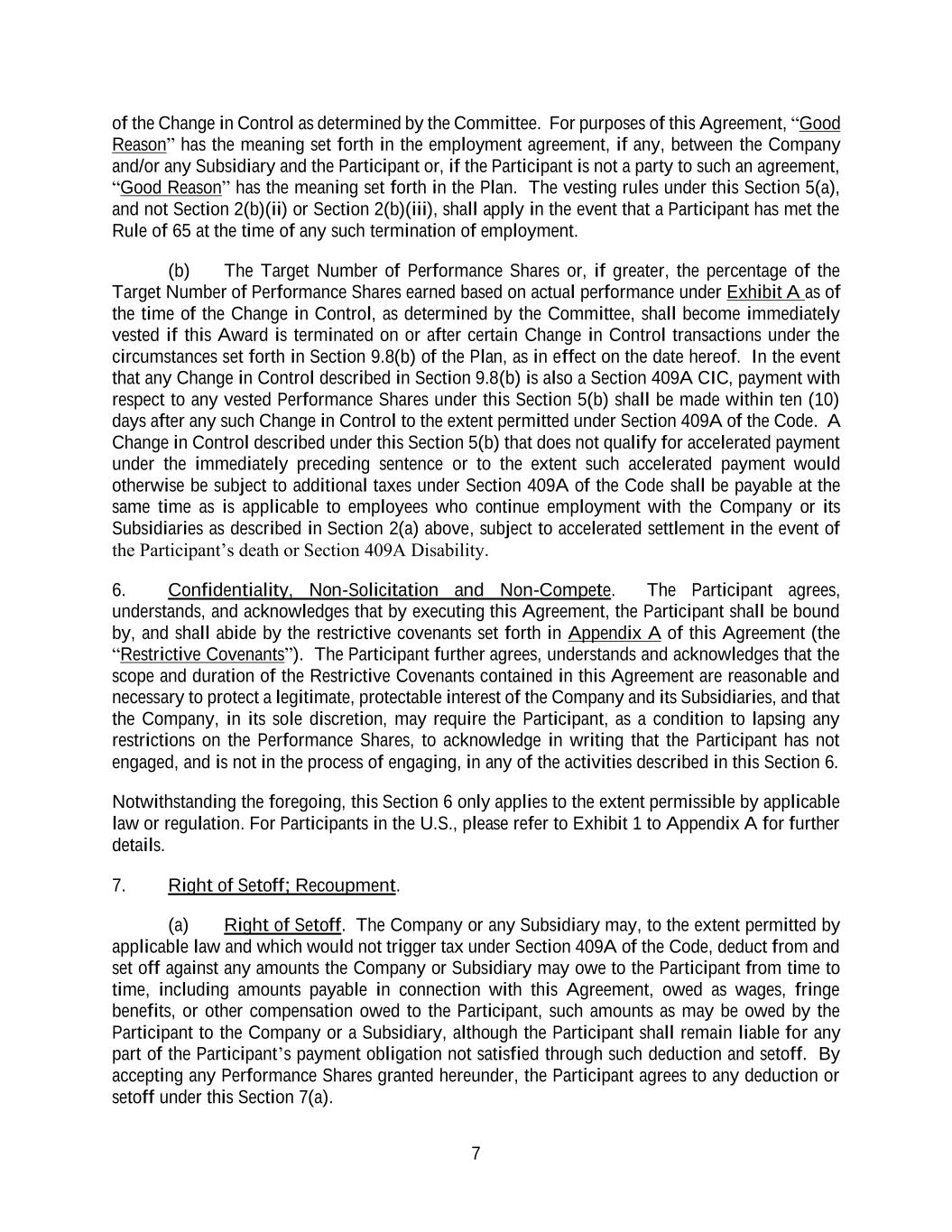 7委员会确定的控制权变更。就本协议而言,“Good Reason”具有公司和/或任何子公司与参与者之间的雇佣协议(如有)中规定的含义,或者,如果参与者不是此类协议的一方,“Good Reason”具有计划中规定的含义。根据本条第5(a)条订立的归属规则,而非第2(b)(ii)条或第2(b)(iii)条,适用于任何参与者在任何该等终止雇用时已符合第65条规则的情况。(b)如果本奖励在计划第9.8(b)节规定的情况下控制权交易发生某些变化时或之后终止,则绩效股份的目标数量或(如更多)根据委员会确定的截至控制权变更时的附件 A项下的实际表现所赚取的绩效股份目标数量的百分比应立即归属,如在本计划第9.8(b)节规定的情况下终止,该情况在本计划当日生效。如果第9.8(b)条所述的任何控制权变更也属于第409A条中投,则应在《守则》第409A条允许的范围内,在任何此类控制权变更后的十(10)天内支付根据第5(b)条规定的任何既得业绩股份。根据本条第5(b)款所述的控制权变更,如不符合根据紧接前一句规定的加速付款条件,或在此种加速付款本应根据《守则》第409A条被征收额外税款的范围内,应在适用于上文第2(a)节所述继续受雇于公司或其子公司的雇员的同时支付,但须在参与者死亡或第409A条残疾的情况下进行加速结算。6.保密、不招揽、不竞争。参与者同意、理解并承认,通过执行本协议,参与者应受本协议附录A中规定的限制性约定(“限制性约定”)的约束,并应遵守这些约定。参与者进一步同意、理解并承认,本协议所载的限制性契约的范围和期限是合理和必要的,以保护公司及其子公司的合法、可保护的利益,并且公司可全权酌情要求参与者(作为对履约股份的任何限制失效的条件)以书面形式承认参与者没有参与,也没有在参与过程中参与本第6节所述的任何活动。尽管有上述规定,本条第6款仅在适用法律或条例允许的范围内适用。对于美国的参与者,请参阅附录A的附件 1了解更多详情。7.抵销权;追偿权。(a)抵销权。公司或任何附属公司可在适用法律许可且不会根据《守则》第409A条触发征税的范围内,从公司或附属公司可能不时欠参与者的任何款项中扣除并抵销,包括与本协议有关的应付款项,作为欠参与者的工资、附加福利或其他补偿所欠的款项,例如参与者可能欠公司或附属公司的款项,虽然参与者应继续对参与者的付款义务的任何部分未通过此类扣除和抵消而得到满足承担责任。通过接受根据本协议授予的任何绩效份额,参与者同意根据本条第7(a)款进行任何扣除或抵销。