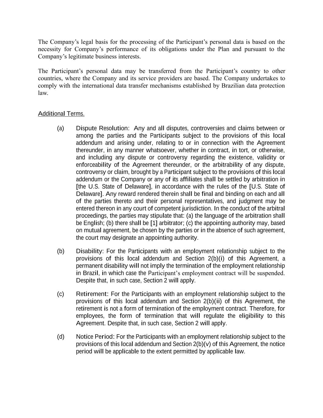 公司处理参与者个人数据的法律依据是基于公司履行计划义务的必要性,并根据公司的合法商业利益。参与者的个人数据可能会从参与者的国家转移到公司及其服务提供商所在的其他国家。公司承诺遵守巴西数据保护法建立的国际数据传输机制。附加条款。(a)争议解决:当事人与参与人之间或之间根据本当地增编的规定产生的、与本协议项下的协议有关的或与本协议项下的协议有关的任何和所有争议、争议和索赔,以任何方式,无论是在合同、侵权或其他方面,包括关于本协议项下协议的存在性、有效性或可执行性的任何争议或争议,或任何争议、争议或索赔的可仲裁性,由受本当地增编规定约束的参与者或公司或其任何关联公司提起的诉讼,应根据[美国特拉华州]的规则,在[美国特拉华州]以仲裁方式解决。其中提供的任何奖励均为最终奖励,并对其每一方和所有各方及其遗产代理人具有约束力,可在任何有管辖权的法院就此作出判决。在进行仲裁程序时,当事各方可规定:(a)仲裁语言应为英文;(b)应有[ 1 ]名仲裁员;(c)指定机构可根据双方协议,由当事各方选择,或在没有此种协议的情况下,法院可指定指定一名指定机构。(b)残疾:对于有受本当地增编和本协定第2(b)(i)节规定约束的雇佣关系的参与者,永久残疾并不意味着终止在巴西的雇佣关系,在这种情况下,参与者的雇佣合同将被中止。尽管如此,在这种情况下,第2节将适用。(c)退休:对于受本当地增编和本协议第2(b)(ii)节规定约束的雇佣关系的参与者,退休不是终止雇佣合同的一种形式。因此,对于员工而言,将规范本协议资格的终止形式。尽管如此,在这种情况下,第2节将适用。(d)通知期:对于有受本当地增编和本协议第2(b)(v)节规定约束的雇佣关系的参与者,通知期将在适用法律允许的范围内适用。