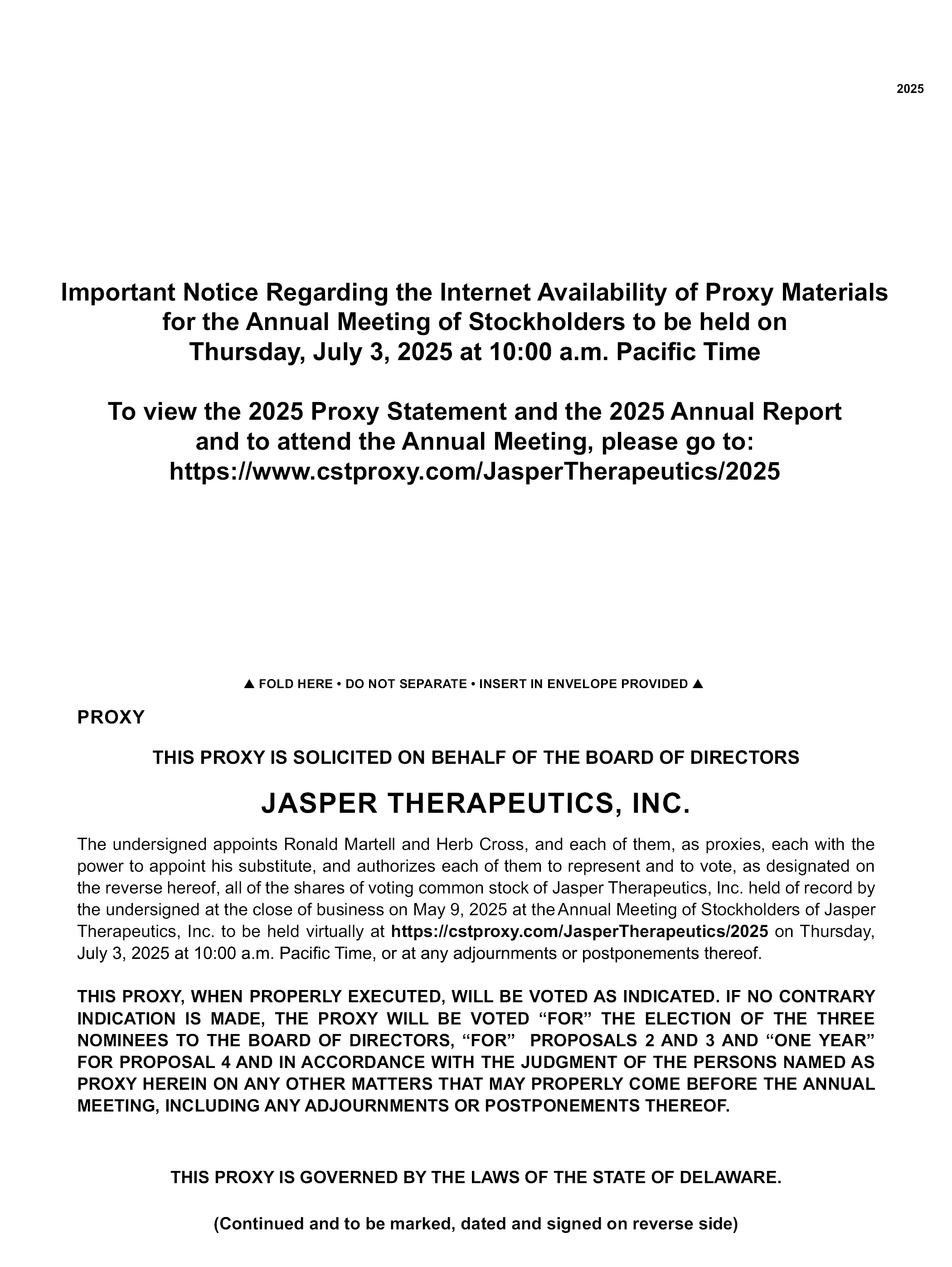 关于太平洋时间2025年7月3日(星期四)上午10:00召开的年度股东大会代理材料互联网可用性的重要通知查看2025年委托书和2025年年度报告并出席年度会议,请访问:https://www.cstproxy.com/JasperTherapeutics/2025197410 Jasper Therapeutics, Inc.代理卡回折在此•不要分开•在信封中插入提供的2025代理此代理是代表JASPER THERAPEUTICS,INC.董事会征集的。以下签署人任命Ronald Martell和Herb Cross,他们每个人作为代理人,每个人都有权任命他的替补,并授权他们每个人代表并投票,如下文背面指定的,在2025年5月9日收盘时由以下签署人在将于太平洋时间2025年7月3日(星期四)上午10:00在https://cstproxy.com/JasperTherapeutics/2025以虚拟方式举行的Jasper Therapeutics,Inc.股东年度会议上,代表并记录在案的Jasper Therapeutics Therapeutics,Inc.的所有有表决权的普通股股份,或在其任何休会或延期会议上。该代理,当适当执行时,将按指示进行投票。如果没有作出相反的指示,代理将被投票“支持”董事会的三名提名人的选举,“支持”提案2和3,“一年”提案4,并根据此处被称为代理的人对可能适当地提交年度会议的任何其他事项的判断,包括其中的任何延期或延期。该代理受特拉华州法律管辖。(续并在反面标记、注明日期和签名)