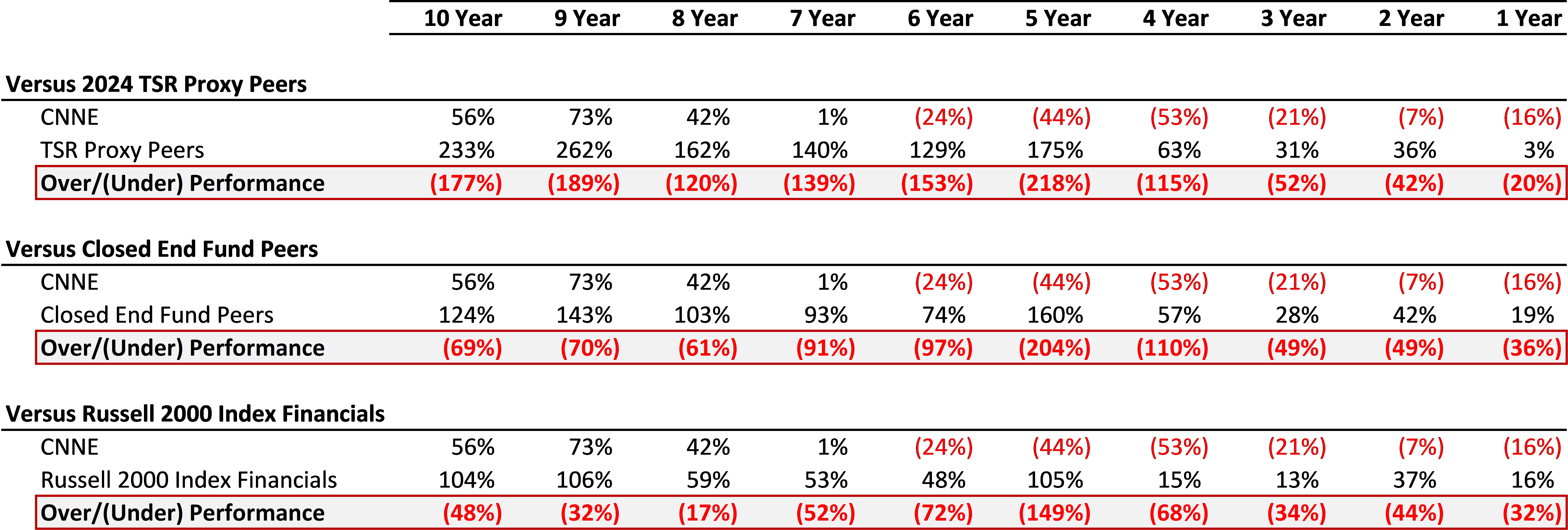 我们投资Cannae是因为我们坚信存在价值创造的重大机会。尽管公司收集了宝贵的资产,但公司长期股价表现不佳、估值持续折价、公司治理实践不佳以及董事会监督不力。我们认为,董事会需要进行有意义的变革,以建立对股东的问责制并释放公司被困的潜力。为此,我们投入了大量时间和资源,招聘了一批高素质、适合目标的独立提名人,我们认为,如果当选,将为董事会带来正确的技能组合和新的视角,以及为所有Cannae股东的利益提高价值的共同目标。