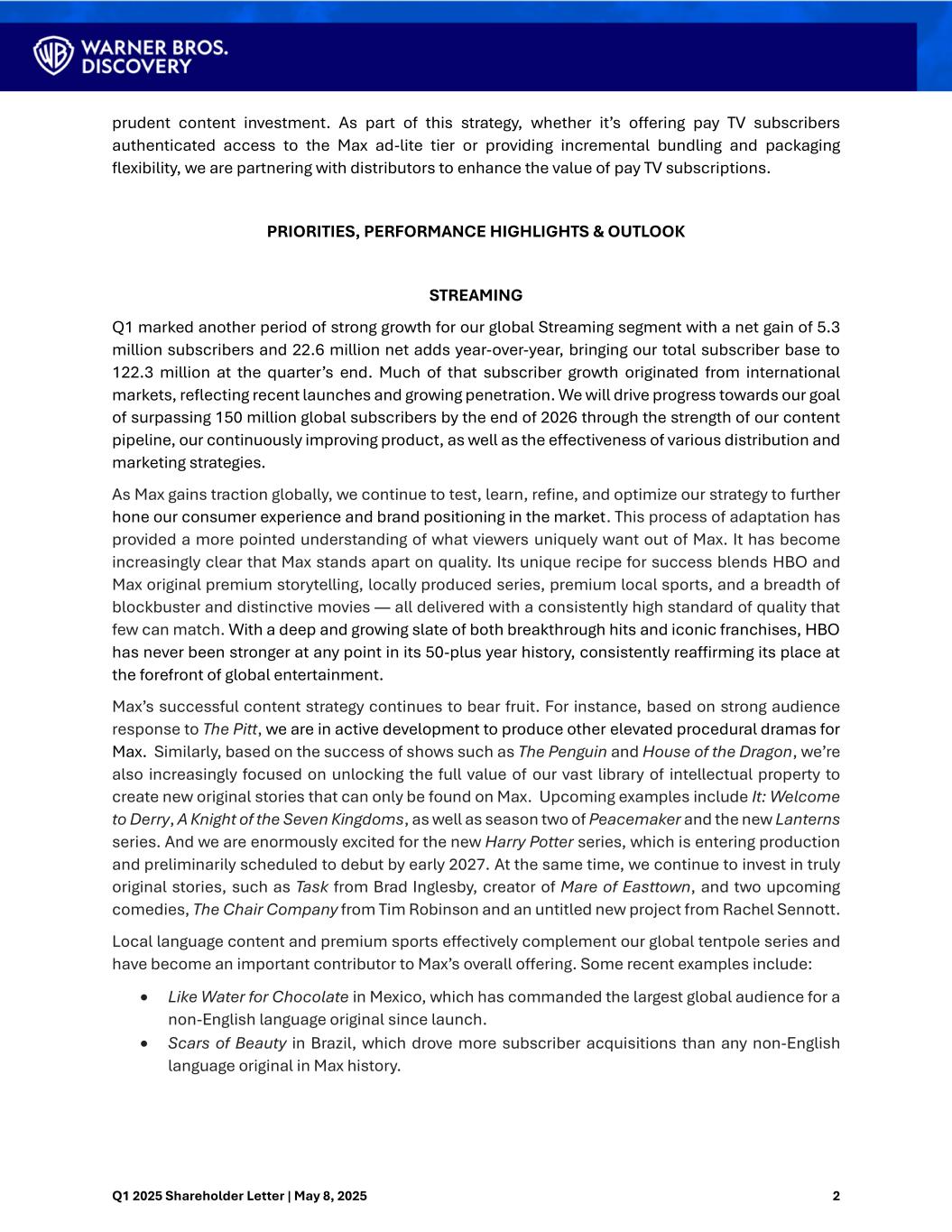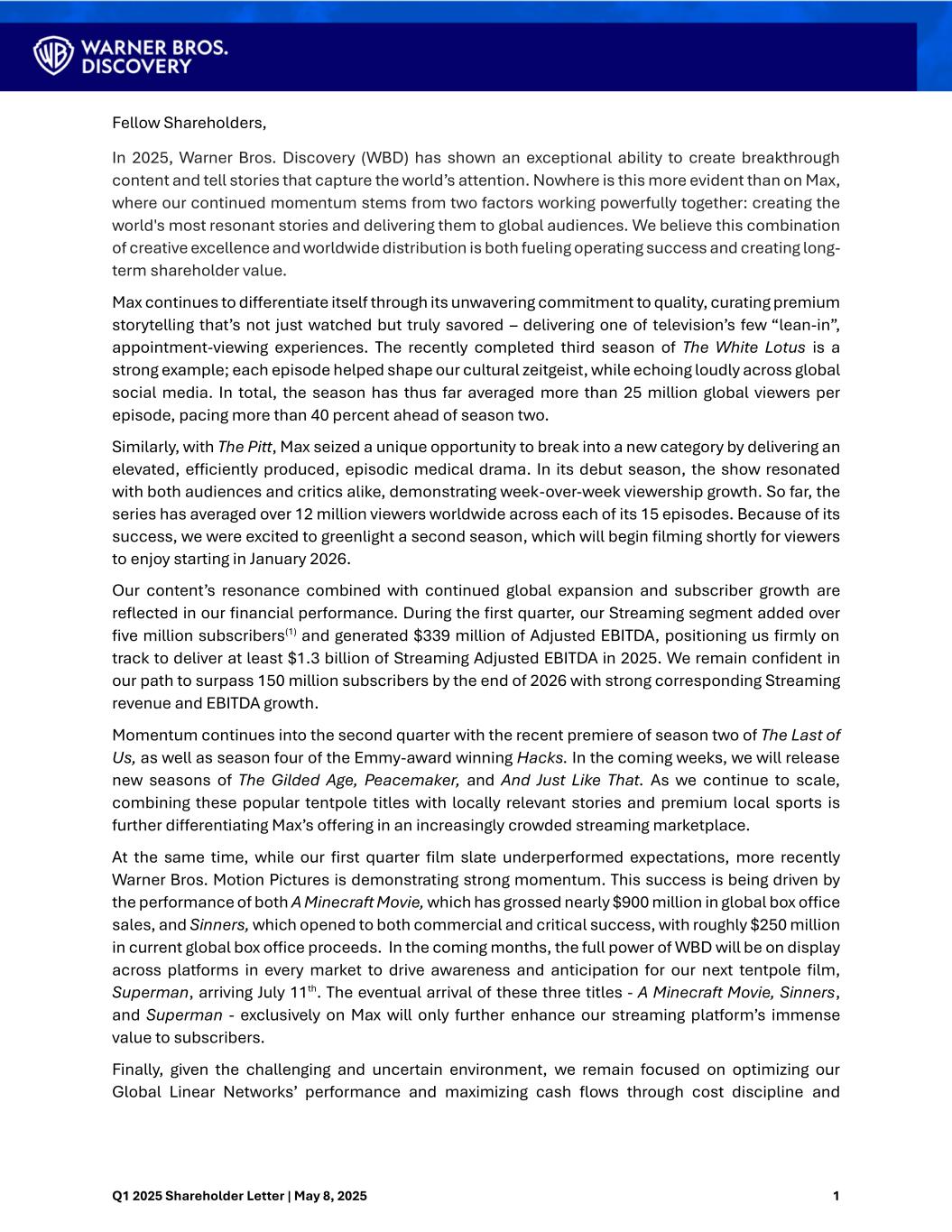 2025年第一季度股东信| 2025年5月8日1同道股东,在2025年,华纳兄弟探索公司(WBD)展示了创造突破性内容和讲述吸引世界注意力的故事的非凡能力。这一点在Max上表现得最为明显,我们的持续势头源于两个因素强有力地协同工作:创造世界上最能引起共鸣的故事并将它们传递给全球观众。我们相信,这种创意卓越和全球分销的结合,既推动了经营成功,也创造了长期的股东价值。Max继续通过其对质量的坚定承诺使自己脱颖而出,策划了不仅被观看而且真正被品味的优质故事讲述——提供电视上为数不多的“精益求精”、预约观看体验之一。最近完成的《白莲花》第三季就是一个强有力的例子;每一集都帮助塑造了我们的文化时代精神,同时在全球社交媒体上大声回响。到目前为止,这一季的总体平均每集全球观众人数超过2500万,比第二季提前了40%以上。同样,凭借《皮特》,马克斯抓住了一个独特的机会,通过提供一部高端、高效制作、情节丰富的医疗剧,打入了一个新的类别。在首播季,该节目引起了观众和评论家的一致共鸣,显示出每周的收视率增长。到目前为止,这部剧集在其15集中的每一集的全球平均观看量都超过了1200万。由于它的成功,我们很高兴为第二季开了绿灯,它将于2026年1月开始很快开始拍摄,供观众欣赏。我们的内容的共振加上持续的全球扩张和用户增长反映在我们的财务业绩中。在第一季度,我们的流媒体部门增加了超过500万用户(1),并产生了3.39亿美元的调整后EBITDA,使我们坚定地走上了在2025年实现至少13亿美元的流媒体调整后EBITDA的轨道。我们仍然对我们的道路充满信心,即到2026年底,我们的订阅用户将超过1.5亿,相应的流媒体收入和EBITDA增长强劲。随着《最后生还者》第二季最近的首播,以及获得艾美奖的Hacks第四季的首播,势头一直延续到第二季度。在接下来的几周里,我们将发布新一季的《镀金时代》、《和平缔造者》,就像这样。随着我们不断扩大规模,将这些广受欢迎的tentpole游戏与当地相关的故事和优质的当地体育节目相结合,正在日益拥挤的流媒体市场中进一步区分Max的产品。与此同时,虽然我们第一季度的电影表现逊于预期,但最近华纳兄弟电影公司正在展示强劲的势头。这一成功是由《我的世界》电影的表现推动的,该电影在全球票房总销售额接近9亿美元,而《罪人》则在商业和关键方面都取得了成功,目前全球票房收入约为2.5亿美元。在接下来的几个月里,WBD的全部力量将在每个市场的跨平台展示,以推动人们对我们的下一部帐篷电影《超人》的认识和期待,它将于7月11日到来。这三款游戏——《我的世界》电影、《罪人》和《超人》——最终在Max上独家发售,只会进一步提升我们流媒体平台对订户的巨大价值。最后,鉴于充满挑战和不确定的环境,我们仍然专注于优化我们的全球线性网络的性能,并通过成本纪律和最大化现金流