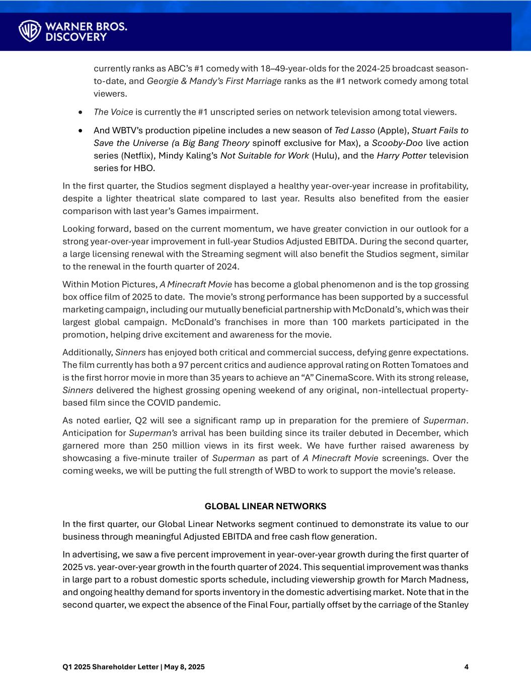 2025年第一季度股东信| 2025年5月8日4目前在2024-25年播出季中以18 – 49岁的年龄排名ABC的# 1喜剧,Georgie & Mandy的《First Marriage》在总观众中排名# 1网络喜剧。• The Voice目前是网络电视总观众中排名# 1的无剧本剧集。•而WBTV的制作管道包括新一季的Ted Lasso(苹果)、Stuart Fails to Save the 大自然药业(Max独家出品的生活大爆炸衍生剧)、史酷比真人系列(Netflix)、Mindy Kaling的《不适合工作》(Hulu),以及HBO的哈利波特电视剧。在第一季度,尽管与去年相比,影院板块有所减少,但影城部门的盈利能力同比实现了健康增长。业绩也得益于与去年的Games减值比较容易。展望未来,基于目前的势头,我们对全年影城调整后EBITDA同比强劲改善的前景更有信心。在第二季度期间,与流媒体部门的大量许可更新也将有利于工作室部门,类似于2024年第四季度的更新。在美国电影公司内部,一部《我的世界》电影已成为一种全球现象,是迄今为止票房最高的2025年电影。这部电影的强劲表现得到了成功的营销活动的支持,包括我们与麦当劳的互利合作伙伴关系,这是他们最大的全球活动。麦当劳在100多个市场的特许经营权参与了此次促销活动,帮助推动了这部电影的兴奋度和知名度。此外,罪人在批评和商业上都获得了成功,这超出了流派的期望。这部电影目前在烂番茄上的评论率和观众支持率均为97%,是35年多来首部取得“A”级影院评分的恐怖电影。凭借强劲的上映表现,《罪人》创下了自新冠疫情以来所有非知识产权原创电影中票房最高的首映周末。如前所述,Q2将出现大幅增长,为《超人》的首映做准备。自去年12月发布的预告片首次亮相以来,人们一直在期待超人的到来,该预告片在首周就获得了超过2.5亿次观看。作为《我的世界》电影放映的一部分,我们展示了一段五分钟的超人预告片,从而进一步提高了人们的认识。在接下来的几周里,我们将投入WBD的全部力量来支持这部电影的上映。全球线性网络在第一季度,我们的全球线性网络部门继续通过有意义的调整后EBITDA和自由现金流产生来展示其对我们业务的价值。在广告方面,与2024年第四季度的同比增长相比,我们看到2025年第一季度的同比增长提高了5%。这一连续改善在很大程度上要归功于强劲的国内体育节目,包括《疯狂三月》的收视率增长,以及国内广告市场对体育库存的持续健康需求。注意,在第二季度,我们预计没有四强,部分被运输的史丹利抵消