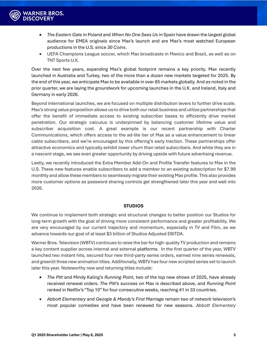 2025年第一季度股东信| 2025年5月8日3 •波兰的The Eastern之门和西班牙没人看到我们的时候,自Max推出以来,EMEA原件吸引了全球最多的观众,也是Max自30枚硬币以来在美国最受关注的欧洲作品。• Max在墨西哥和巴西以及在TNT Sports UK上进行的欧洲冠军联赛足球比赛,在接下来的几年里,扩大Max的全球足迹仍然是一个关键的优先事项。Max最近在澳大利亚和土耳其推出,这是针对2025年的十多个新市场中的两个。到今年年底,我们预计Max将在全球超过85个市场上市。正如上一季度所指出的,我们正在为即将于2026年初在英国和爱尔兰、意大利和德国推出的产品奠定基础。除了国际发布,我们还专注于多种分销杠杆,以进一步推动规模。Max强大的价值主张使我们能够推动我们的零售业务,并利用提供即时访问现有用户群的好处的合作伙伴关系来有效推动市场渗透。我们的战略演算以平衡客户生命周期价值和用户获取成本为基础。一个很好的例子是我们最近与Charter通信的合作伙伴关系,该合作伙伴提供了Max的AD-Lite层的访问权限,作为对线性电缆用户的价值提升,我们对这一产品的早期吸引力感到鼓舞。这些合作伙伴关系提供了有吸引力的经济性,并且通常表现出比零售用户更低的流失率。当它们处于新生阶段时,我们通过推动未来广告收入的上行,看到了更大的机会。最后,我们最近在美国向Max推出了额外的会员附加功能和配置文件传输功能。这些新功能使订阅者能够以每月7.99美元的价格向现有订阅添加会员,并允许这些会员无缝迁移其现有的Max个人资料。这也为客户提供了更多选择,因为密码共享控制将在今年晚些时候得到加强,并一直持续到2026年。STUDIOS我们继续实施战略和结构变革,以更好地定位我们的工作室以实现长期增长,目标是推动更稳定的业绩和更大的盈利能力。我们对目前的发展轨迹和势头感到非常鼓舞,尤其是在电视和电影领域,因为我们正在朝着工作室调整后EBITDA至少30亿美元的目标前进。华纳兄弟电视公司(WBTV)继续提高高质量电视制作的标准,并且仍然是跨内部和外部平台的关键内容供应商。在今年第一季度,WBTV推出了两个即时热播剧,获得了四个新的第三方系列订单,获得了九个系列续订,并为三个新的动画作品开了绿灯。此外,WBTV还将在今年晚些时候推出四个新的剧本系列。值得注意的新游戏和回归游戏包括:•《Pitt》和《Mindy Kaling的Running Point》,这两部2025年的顶级新剧,已经获得了续订订单。The Pitt在Max上的成功如上所述,Running Point连续四周位列Netflix“TOP10”,在33个国家中排名第一。• Abbott Elementary和Georgie & Mandy的第一次婚姻仍然是网络电视最受欢迎的两部喜剧,并且已经续订了新一季。雅培小学