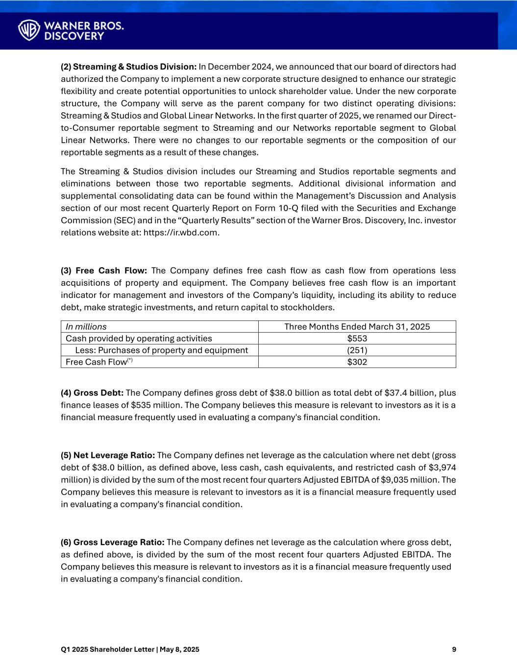 2025年第一季度股东信| 2025年5月8日9(2)Streaming & Studios Division:2024年12月,我们宣布董事会已授权公司实施新的公司结构,旨在增强我们的战略灵活性并创造释放股东价值的潜在机会。在新的公司结构下,公司将作为两个不同运营部门的母公司:Streaming & Studios和Global Linear Networks。在2025年第一季度,我们将直接面向消费者的可报告分部更名为流媒体,并将我们的网络可报告分部更名为全球线性网络。我们的可报告分部或可报告分部的构成没有因这些变化而发生变化。流媒体和工作室部门包括我们的流媒体和工作室可报告分部以及这两个可报告分部之间的冲销。更多部门信息和补充合并数据可在我们最近提交给美国证券交易委员会(SEC)的10-Q表格季度报告的管理层讨论和分析部分以及华纳兄弟探索公司投资者关系网站的“季度业绩”部分找到:https://ir.wbd.com。(3)自由现金流:公司将自由现金流定义为经营活动产生的现金流减去购置物业和设备。该公司认为,自由现金流是管理层和投资者对公司流动性的重要指标,包括其减少债务、进行战略投资和向股东返还资本的能力。百万截至2025年3月31日止三个月经营活动提供的现金553美元减:购买物业和设备(251)自由现金流(*)302美元(4)总债务:公司将380亿美元的总债务定义为374亿美元的总债务,加上5.35亿美元的融资租赁。该公司认为,这一衡量标准与投资者相关,因为它是一种经常用于评估公司财务状况的财务衡量标准。(5)净杠杆率:公司将净杠杆定义为净债务(如上定义的总债务为380亿美元,减去现金、现金等价物和39.74亿美元的限制性现金)除以最近四个季度调整后EBITDA之和903.5亿美元的计算。该公司认为,这一衡量标准与投资者相关,因为它是一种经常用于评估公司财务状况的财务衡量标准。(6)毛杠杆率:公司将净杠杆定义为计算方法,其中如上定义的总债务除以最近四个季度调整后EBITDA之和。该公司认为,这一衡量标准与投资者相关,因为它是一种经常用于评估公司财务状况的财务衡量标准。