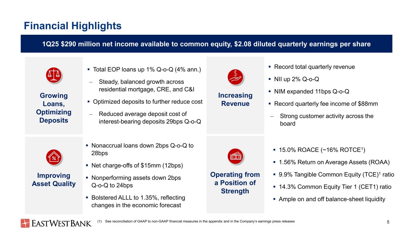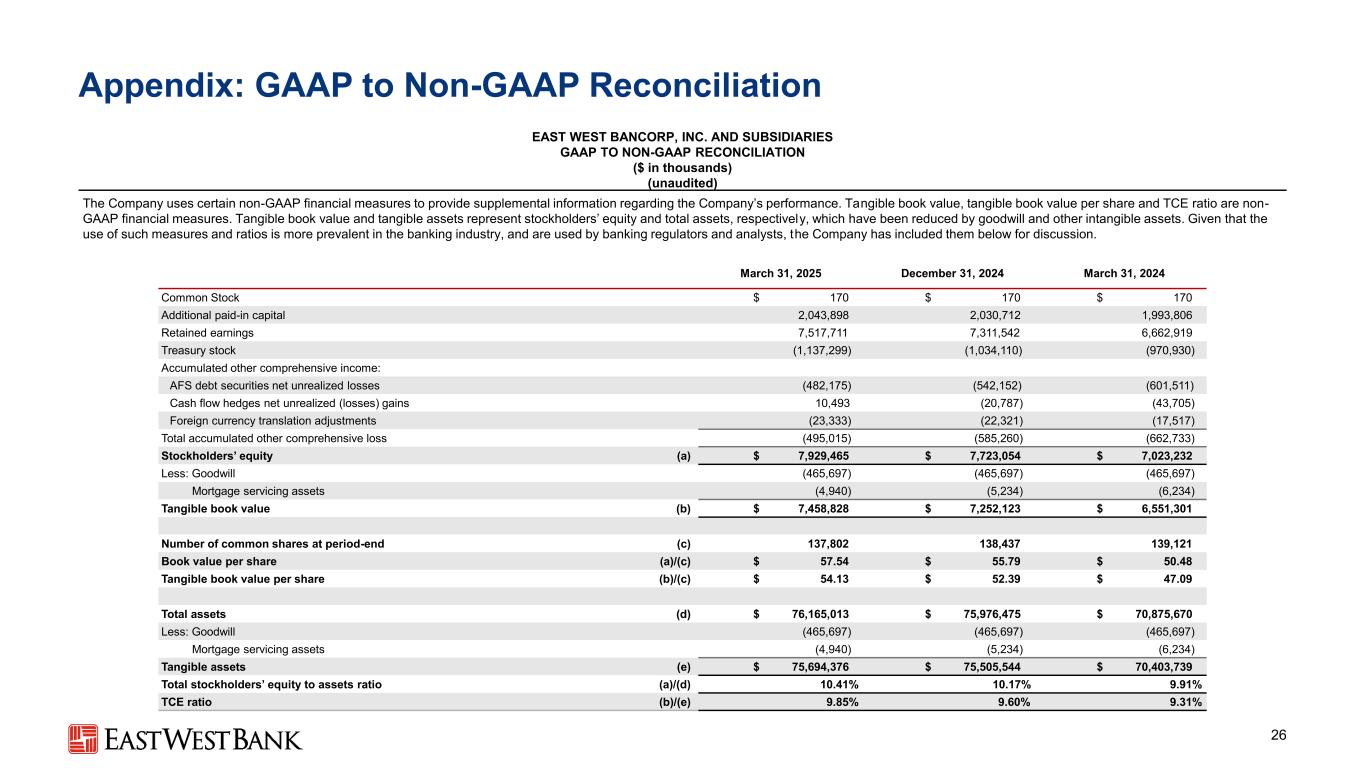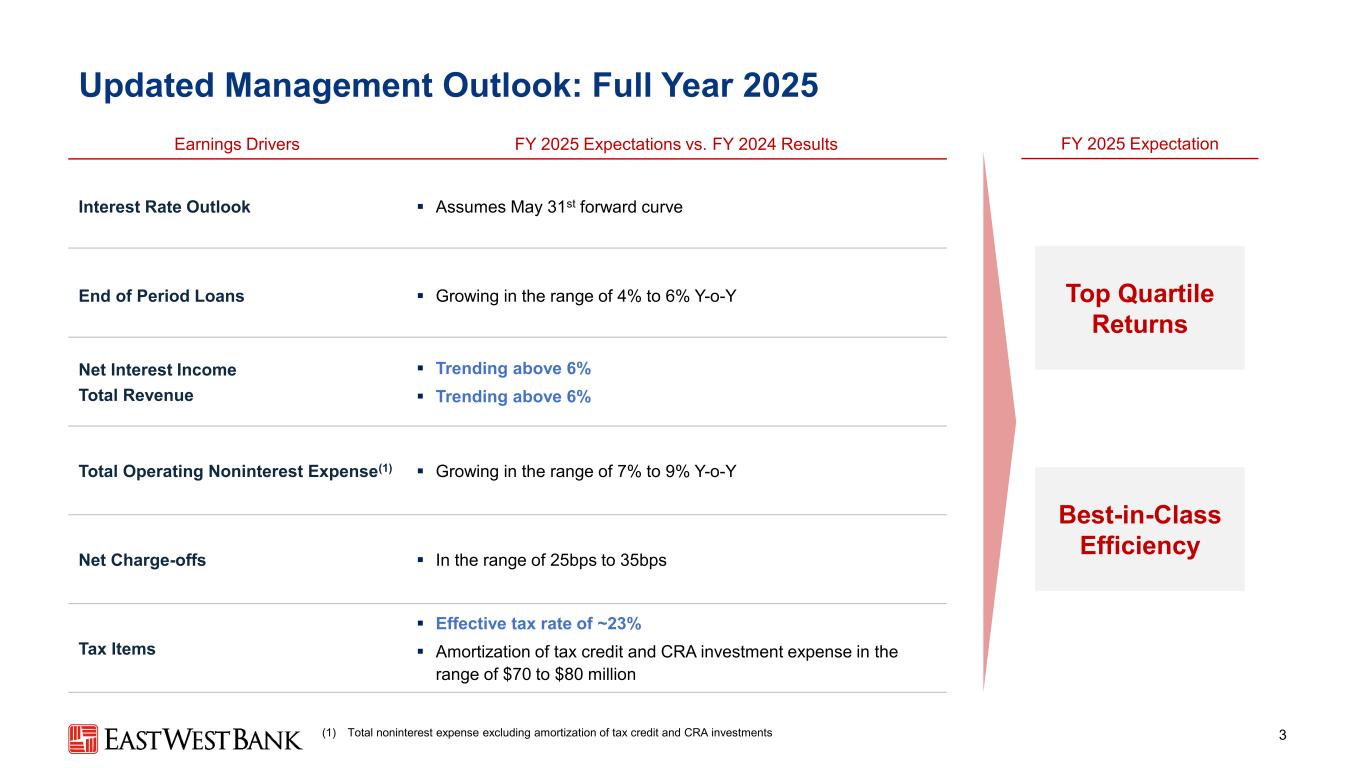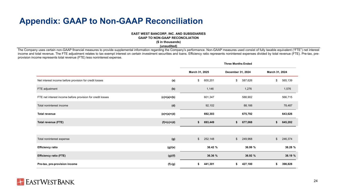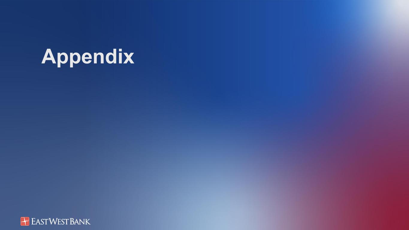 本演示文稿中的前瞻性陈述和附加信息中,“我们”、“我们的”、“我们”、“East West”和公司是指East West Bancorp, Inc.和我们的合并子公司,除非上下文另有说明。前瞻性陈述本演示文稿包含前瞻性陈述,这些陈述旨在被1995年《私人证券诉讼改革法案》提供的此类陈述的安全港所涵盖。这些陈述是基于当前的假设、信念、估计和预测,其中许多就其性质而言,本质上是不确定的,超出了我们的控制范围。你不应该过分依赖这些说法。有多种重要因素可能导致公司未来业绩与历史业绩和任何前瞻性陈述存在重大差异,包括公司向美国证券交易委员会提交的文件中描述的因素,包括公司截至2024年12月31日止年度的10-K表格年度报告中的“风险因素”部分。在考虑这些前瞻性陈述时,您应该牢记这些风险和不确定性,以及公司可能做出的任何警示性陈述。这些声明仅在作出之日发表,并且仅基于公司当时实际知道的信息。除法律要求外,公司不承担并明确否认更新或修改任何前瞻性陈述的任何义务,无论是书面的还是口头的。列报基础按照美国公认会计原则(“GAAP”)编制公司合并财务报表要求管理层作出估计和假设,这些估计和假设会影响截至合并财务报表日期的资产和负债的呈报金额、报告期内的收入和支出以及相关披露。尽管我们的估计考虑了当前的情况以及我们预计它们在未来将如何变化,但实际结果可能与这些估计存在重大差异,这是合理的。因此,本期的经营业绩并不一定表明任何未来中期或全年的预期结果。某些前期信息已重新分类,以符合当前的列报方式。行业信息本演示文稿包括我们从政府报告和其他第三方来源获得的统计数据以及其他行业和市场数据。虽然我们认为这些信息是准确可靠的,但我们没有对这些信息进行独立核实。我们从这些来源获得的前瞻性信息受到与本文所包含的其他前瞻性陈述相同的不确定性和限定条件的影响。非GAAP财务指标本演示文稿中的某些财务信息未按照GAAP编制,而是在非GAAP基础上呈现。投资者应参考本演示文稿附录中包含的对账,并应考虑公司的非GAAP措施是根据GAAP编制的措施的补充,而不是替代或优于这些措施。这些措施可能无法与其他公司使用的类似标题的措施相提并论。2