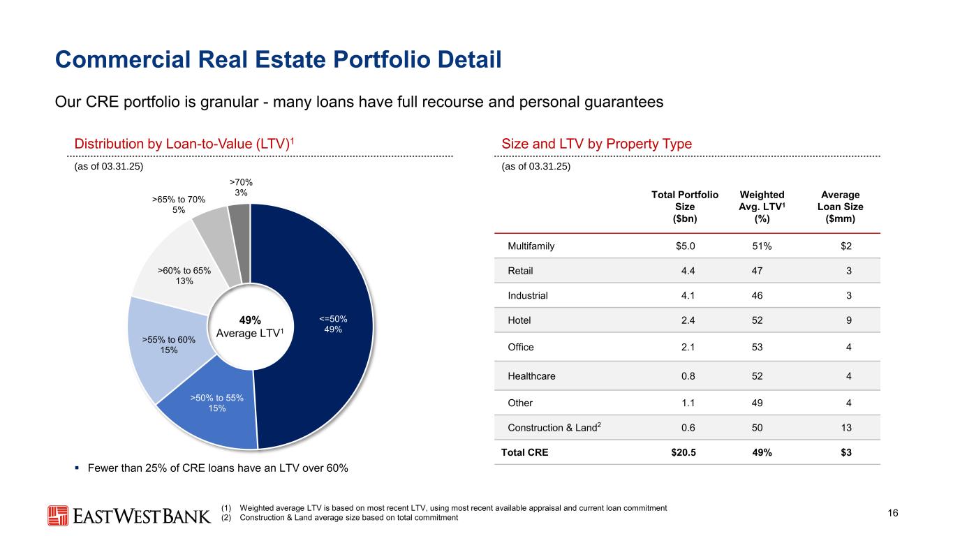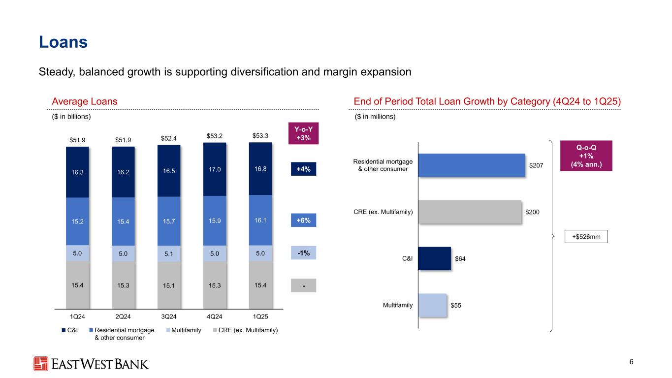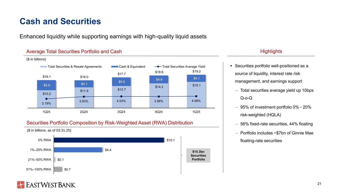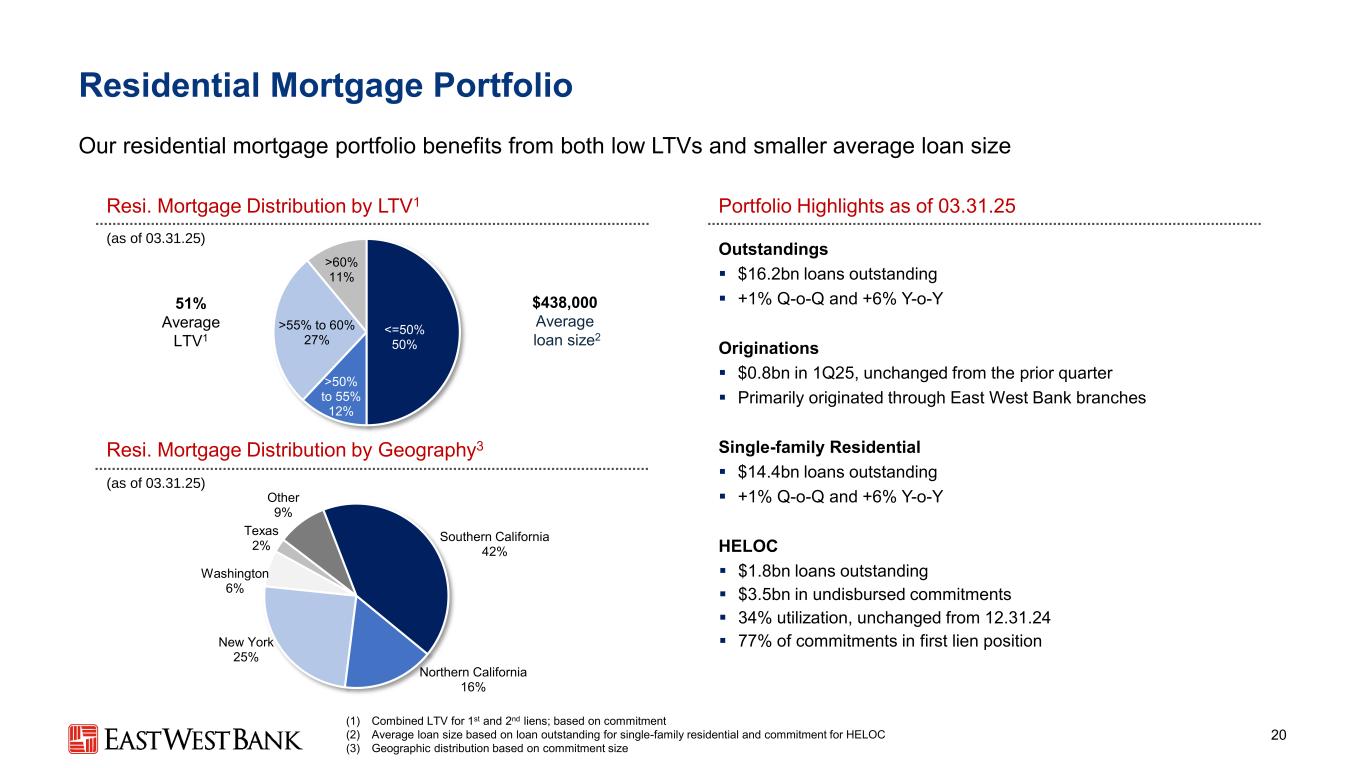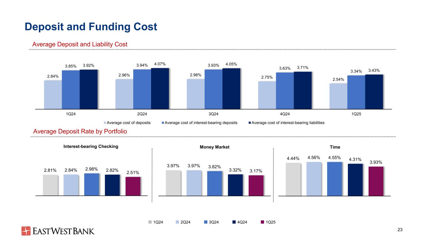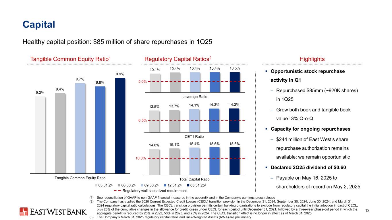 本演示文稿中的前瞻性陈述和附加信息中,“我们”、“我们的”、“我们”、“East West”和公司是指East West Bancorp, Inc.和我们的合并子公司,除非上下文另有说明。前瞻性陈述本演示文稿包含前瞻性陈述,这些陈述旨在被1995年《私人证券诉讼改革法案》提供的此类陈述的安全港所涵盖。这些陈述是基于当前的假设、信念、估计和预测,其中许多就其性质而言,本质上是不确定的,超出了我们的控制范围。你不应该过分依赖这些说法。有多种重要因素可能导致公司未来业绩与历史业绩和任何前瞻性陈述存在重大差异,包括公司向美国证券交易委员会提交的文件中描述的因素,包括公司截至2024年12月31日止年度的10-K表格年度报告中的“风险因素”部分。在考虑这些前瞻性陈述时,您应该牢记这些风险和不确定性,以及公司可能做出的任何警示性陈述。这些声明仅在作出之日发表,并且仅基于公司当时实际知道的信息。除法律要求外,公司不承担并明确否认更新或修改任何前瞻性陈述的任何义务,无论是书面的还是口头的。列报基础按照美国公认会计原则(“GAAP”)编制公司合并财务报表要求管理层作出估计和假设,这些估计和假设会影响截至合并财务报表日期的资产和负债的呈报金额、报告期内的收入和支出以及相关披露。尽管我们的估计考虑了当前的情况以及我们预计它们在未来将如何变化,但实际结果可能与这些估计存在重大差异,这是合理的。因此,本期的经营业绩并不一定表明任何未来中期或全年的预期结果。某些前期信息已重新分类,以符合当前的列报方式。行业信息本演示文稿包括我们从政府报告和其他第三方来源获得的统计数据以及其他行业和市场数据。虽然我们认为这些信息是准确可靠的,但我们没有对这些信息进行独立核实。我们从这些来源获得的前瞻性信息受到与本文所包含的其他前瞻性陈述相同的不确定性和限定条件的影响。非GAAP财务指标本演示文稿中的某些财务信息未按照GAAP编制,而是在非GAAP基础上呈现。投资者应参考本演示文稿附录中包含的对账,并应考虑公司的非GAAP措施是根据GAAP编制的措施的补充,而不是替代或优于这些措施。这些措施可能无法与其他公司使用的类似标题的措施相提并论。2
