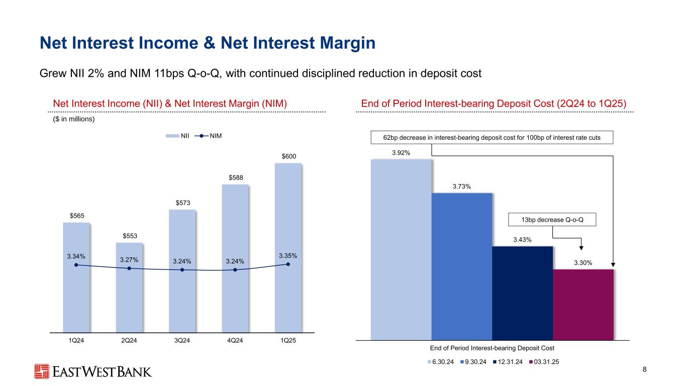 $(360)$(281)$ 69 $ 449 IB Checking & Savings Non-Interested Demand Money Market Time 15.01 4.71 4.6 15.01 5.19.59.39.59.79.79.59.51 3.61 3.71 4.21 4.31 4.8 19.32 1.02 2.32 2.92 3.2 $ 57.4 $ 58.7 $ 60.6 $ 61.9 $ 62.6 1Q24 2Q24 3Q24 4Q24 1Q25 Deposits 7 Optimized mix to further lower cost;with increasing average balances across most categories($ billions)average deposits end of total deposit growth by categories(4Q24 to 1Q25)($ in millions)$(123)mm time MMDA IB