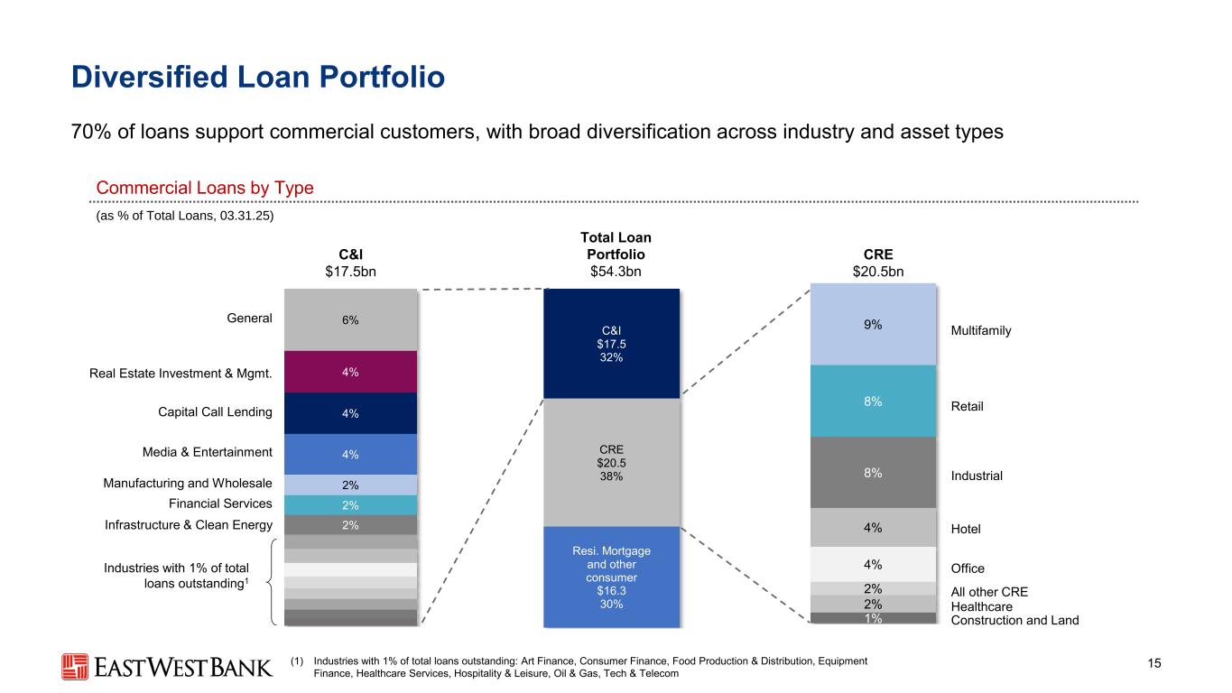 East West一览14(1)GAAP与非GAAP财务指标的对账见附录和公司收益新闻稿(2)EWBC同行包括BKU、BOKF、BPOP、CFG、CFR、CMA、TERM5、COLB、FCNC.A、FITB、HBAN、KEY、MTB、TERM9、NTRS、PNFP、RF、SSB、SNV、VLY、WAL、WTFC、ZION。资料来源:标普 Capital IQ $ 12B市值$ 76B资产$ 63B存款16% ROTCE1 03.3 1.2503.3 1.2503.3 1.2503.3 1.25▪总部位于加利福尼亚州帕萨迪纳▪在纳斯达克工作超25年▪成立于1973年-超过50年的运营根植于美国亚裔美国移民社区,扩展至横跨太平洋的桥梁业务获奖公司# 2024年表现最佳银行第一名、500 + billion美元(银行董事)# 2022年表现最佳银行第一名、100 + billion美元(标普全球)卓越CRA评级具有跨境能力的领先区域性银行..。…产生一致的顶级股东回报…Peer Median2 EWBC 20202021202220232023202410.0% 16.7% 17.1% 15.2% 14.2% 12.4% 17.2% 21.3% 19.4% 17.0% ROTCE1 0.8% 1.3% 1.1% 1.0% 1.0% 1.2% 1.5% 1.8% 1.7% 1.6% ROAA 20202021202220232024