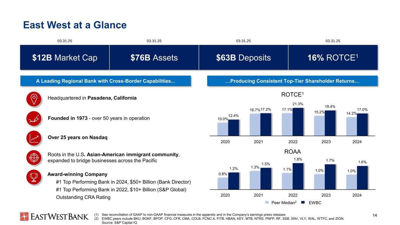 06.3 0.24 9.3% 9.4% 9.7% 9.6% 9.9%有形普通股权益比率14.8% 15.1% 15.4% 15.6% 15.6%总资本比率13.5% 13.7% 14.1% 14.3% 14.3% CET1比率10.1% 10.4% 10.4% 10.4% 10.5%杠杆率Capital 13健康的资本状况:第一季度8500万美元的股票回购突出03.3 1.24 12.3 1.2409.3 0.24▪第一季度的机会性股票回购活动——在25年第一季度回购了85mm(~92万股)——账面均增长和有形账面价值13%环比▪进行中的回购的能力—— 2.44亿美元的East West股票回购授权仍然可用;我们仍然是机会主义的▪宣布的2Q25股息为0.60美元——将于2025年5月16日支付给2025年5月2日登记在册的股东监管资本充足要求有形普通股权益比率1监管资本比率26.5% 5.0% 10.0% 03.3 1.253(1)见附录和公司收益新闻稿中的GAAP与非GAAP财务指标的对账(2)公司已在2024年12月31日应用了2020年当前预期信用损失(CECL)过渡条款,2024年9月30日、2024年6月30日、2024年3月31日监管资本比例测算。CECL过渡条款允许某些银行组织从监管资本中排除CECL的初始采用影响,加上CECL项下信用损失准备金每期累计变化的25%,直至2021年12月31日,然后是三年淘汰期,其中总收益在2022年减少25%,在2023年减少50%,在2024年减少75%。CECL过渡效应自2025年3月31日起不再生效(3)公司2025年3月31日监管资本比率和风险加权资产(RWA)初步