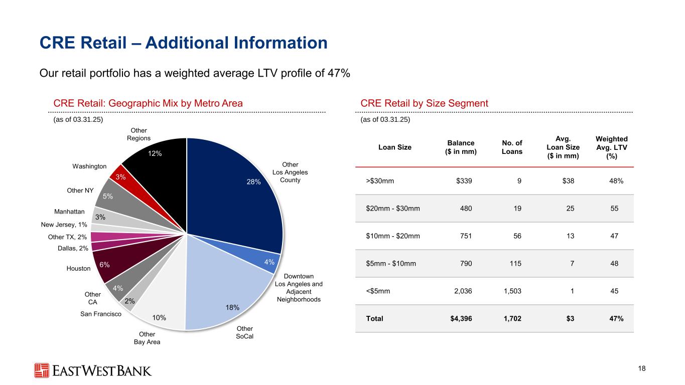 CRE Office –附加信息17我们的办公组合跨细分市场的LTV较低,平均贷款规模较低CRE Office:按都会区划分的地理组合CRE Office按规模细分市场划分(截至03.3 1.25)(截至03.3 1.25)贷款规模余额($ in mm)贷款平均数量。贷款规模($ in mm)加权平均。LTV(%)> $ 30mm $ 2777 $ 4055% $ 20mm-$ 30mm 419172559 $ 10mm-$ 20mm 498351456 $ 5mm-$ 10mm 41957751 < $ 5mm 532401144 total $ 2,145517 $ 453% 37% 6% 12% 9% 7% 3% 4% 3% 6% 6%其他洛杉矶县其他SoCal其他湾区旧金山其他加利福尼亚州,1%休斯顿达拉斯曼哈顿,1%其他德克萨斯州华盛顿其他地区新泽西州其他纽约州,1%洛杉矶市中心和邻近社区