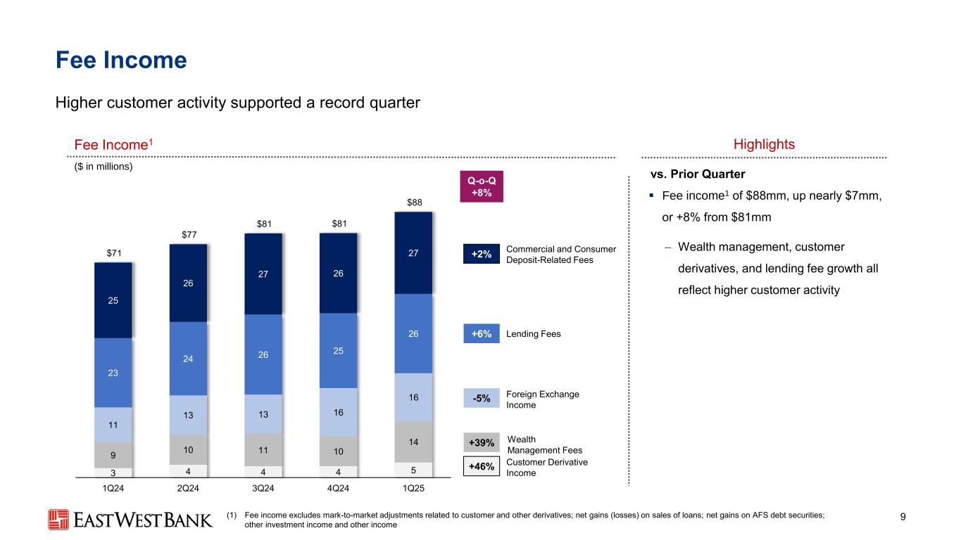 3.92% 3.73% 3.43% 3.30%期末计息存款成本6.3 0.24 9.3 0.24 12.3 1.24 03.3 1.25净利息收入&净息差8 NII增长2%,NIM环比增长11bps,存款成本继续有纪律地降低(百万美元)净利息收入(NII)&净息差(NIM)期末计息存款成本(2Q24至1Q25)$ 565 $ 553 $ 573 $ 588 $ 6003.34% 3.27% 3.24% 3.24% 3.35% 1Q24 2Q24 3Q24 4Q24 1Q25 NII NIM 62bp降息100bp计息存款成本环比下降13bp
