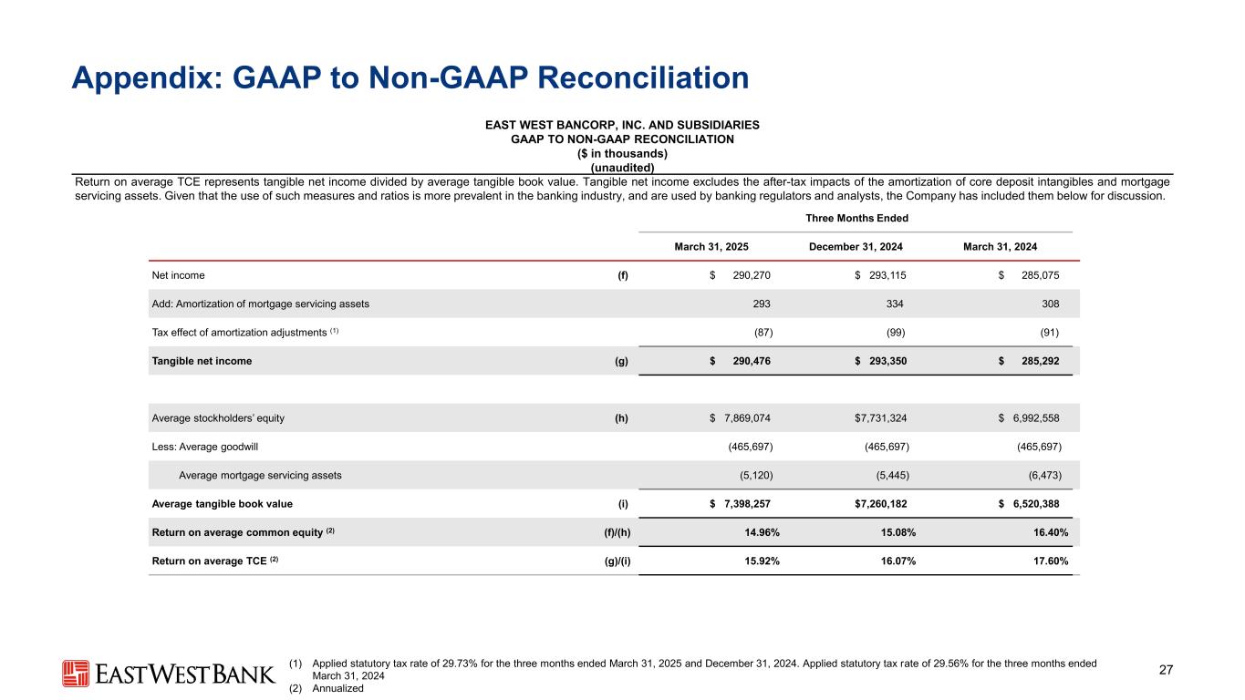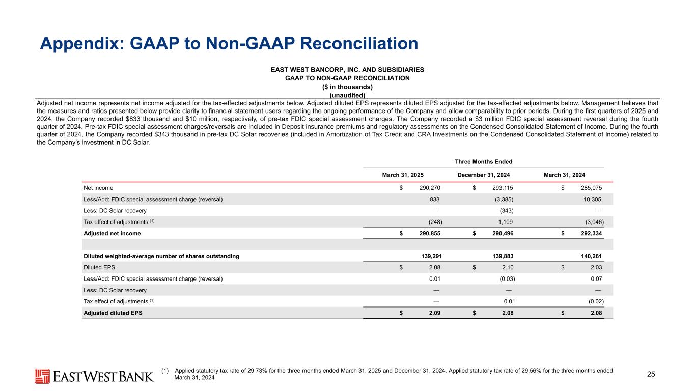 附录:GAAP与Non-GAAP和解25 EAST WEST BANCORP,INC。和子公司GAAP与NON-GAAP对账(千美元)(未经审计)调整后的净收入是指根据以下受税收影响的调整调整调整后的净收入。调整后的稀释每股收益是指根据以下受税收影响的调整调整后的稀释每股收益。管理层认为,下文提出的措施和比率为财务报表用户提供了关于公司持续业绩的明确性,并允许与以前各期进行比较。在2025年和2024年第一季度,该公司分别记录了83.3万美元和1000万美元的税前FDIC特别评估费用。该公司在2024年第四季度录得300万美元的FDIC特别评估逆转。税前FDIC特别评估费用/冲销包含在存款保险费和简明综合损益表的监管评估中。在2024年第四季度,公司记录了与公司对DC Solar的投资相关的34.3万美元的税前DC Solar回收(包括在简明综合损益表中的税收抵免和CRA投资的摊销中)。截至2025年3月31日止三个月2024年12月31日,2024年净收入$ 290,270 $ 293,115 $ 285,075减/加:FDIC特别评估费用(冲销)833(3,385)10,305减:DC Solar回收——(343)——调整的税收影响(1)(248)1,109(3,046)调整后净收入$ 290,855 $ 290,496 $ 292,334稀释加权平均流通股数139,291139,883140,261稀释每股收益$ 2.08 $ 2.10 $ 2.03减/加:FDIC特别评估费用(冲销)0.01(0.03)0.07减:DC Solar回收——调整的税收影响(1)—0.01(0.02)调整后稀释后每股收益$ 2.09 $ 2.08 $ 2.08(1)适用法定税率29.73%截至2025年3月31日和2024年12月31日止三个月。截至2024年3月31日止3个月适用法定税率29.56%