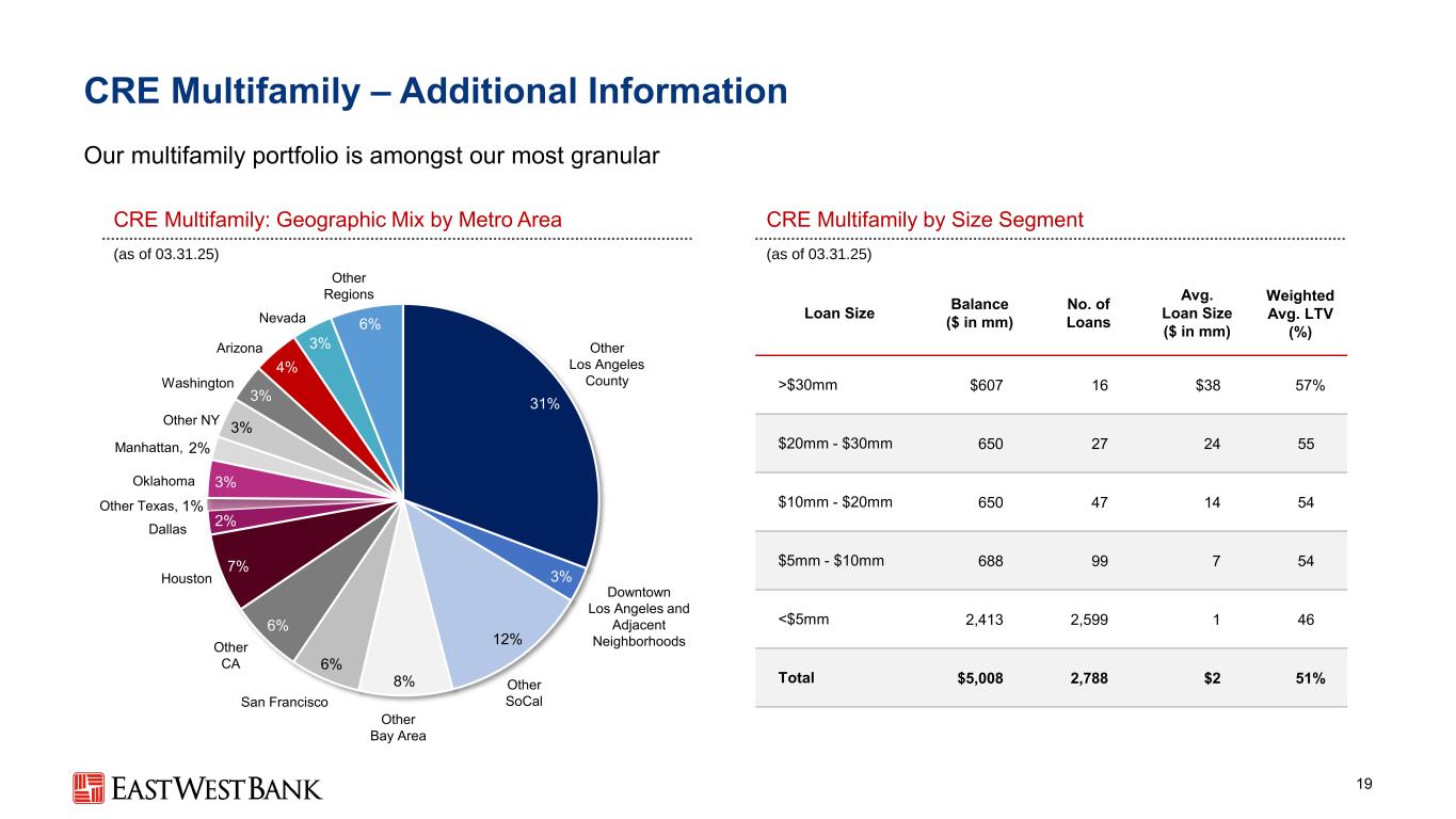 28% 4% 18% 10% 2% 4% 6% 3% 5% 3% 12% CRE零售–附加信息18我们的零售组合的加权平均LTV概况为47% CRE零售:按都会区划分的地理组合CRE零售按规模段划分(截至03.3 1.25)(截至03.3 1.25)贷款规模余额($ in mm)贷款平均数量。贷款规模($ in mm)加权平均。LTV(%)> $ 30mm $ 3399 $ 3848% $ 20mm-$ 30mm 480192555 $ 10mm-$ 20mm 751561347 $ 5mm-$ 10mm 790115748 < $ 5mm 2,0361,503145 total $ 4,3961,702 $ 347%其他洛杉矶县洛杉矶市中心和邻近社区其他SoCalOther Bay Area San Francisco Other 加利福尼亚州 Houston Dallas,2% Manhattan Other TX,2% Washington Other Regions Other NY New Jersey,1%