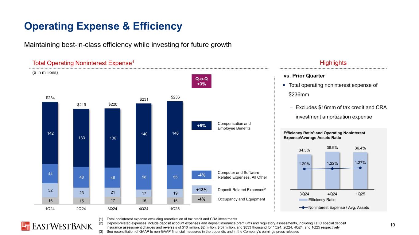 344459 10111014111313161623242625262526272627 $ 71 $ 77 $ 81 $ 88 1Q24 2Q24 3Q24 4Q24 1Q25费用收入1费用收入9更高的客户活动支撑了创纪录的季度(百万美元)(1)费用收入不包括与客户和其他衍生品相关的按市值调整;出售贷款的净收益(损失);AFS债务证券的净收益;其他投资收入和其他收入▪手续费收入1为88mm,较81mm上涨近7mm,涨幅+ 8% −财富管理、客户衍生品,和借贷费用增长均反映客户活动增加亮点财富管理费用客户衍生收入+ 6% + 39% + 46%环比+ 8% + 2%-5 %商业和消费者存款相关费用借贷费用外汇收入较上一季度