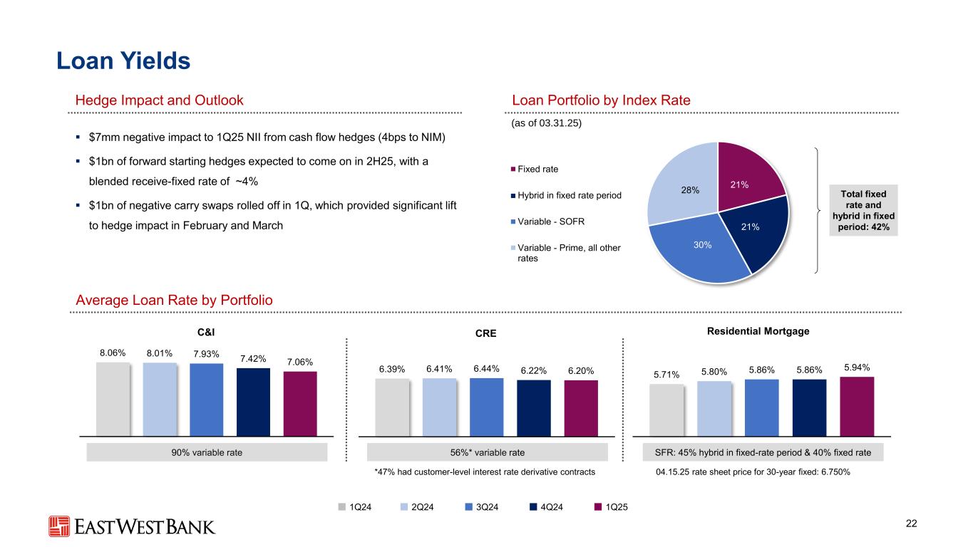 平均总证券投资组合和现金现金和证券21增强了流动性,同时以高质量的流动性资产支持收益(十亿美元)▪作为流动性、利率风险管理和盈利支持来源的证券投资组合处于有利地位−总证券平均收益率环比上升10bps − 95%的投资组合0%-20%风险加权(HQLA)− 56%的固定利率证券,44%的浮动−投资组合包括约70亿美元的Ginnie Mae浮动利率证券亮点按风险加权资产(RWA)分布的证券投资组合构成(十亿美元,截至03.3 1.25)$ 10.2 $ 11.9 $ 12.7 $ 14.2 $ 15.1 $ 5.9 $ 4.1 $ 5.0 $ 4.6 $ 4.1 $ 16.1 $ 16.0 $ 17.7 $ 18.8 $ 19.2 3.19% 3.93% 4.03% 3.98% 4.08% 1Q24 2Q24 3Q24 4Q24 1Q25证券和转售协议总额现金和等值总证券平均收益率153亿美元证券投资组合$ 0.7 $ 0.1 $ 4.4 $ 10.151%丨100% RWA 21%丨50% RWA 1%丨20% RWA 0% RWA