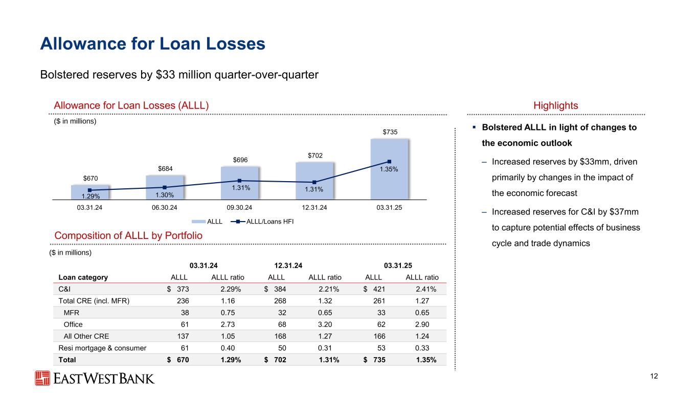 1.25% 1.22% 1.20% 1.35% 1.38% 1.05% 0.83% 0.88% 0.83% 0.91% 2.30% 2.05% 2.08% 2.18% 2.29% 03.3 1.24 06.3 0.24 09.3 0.24 12.31.24 03.3 1.25分类贷款/贷款HFI关注类贷款/贷款HFI $ 25 $ 37 $ 42 $ 70 $ 49 $ 23 $ 29 $ 64 $ 15 $-$ 10 $ 20 $ 30 $ 40 $ 50 $ 60 $ 70 $ 80 1Q24 2Q24 3Q24 4Q24 1Q25信贷损失准备金净冲销资产质量指标11经营状况稳健,净冲销趋势下降和不良资产信用损失准备金和净冲销(百万美元)不良资产被批评的贷款/贷款HFI被批评的比率按贷款HFI投资组合(百万美元)NPA/总资产0.23% 0.27% 0.26% 0.26% 0.24% NCO比率(ann.)0.17% 0.18% 0.22% 0.48% 0.12% 4967758676475252546747421414517304935295555 $ 165 $ 196 $ 195 $ 194 $ 18203.3 1.24 06.3 0.2409.3 0.24 12.3 1.24 03.3 1.25多户奥利奥和其他CRE(ex。MFR)Resi.Mortgage & Consumer C & I 2.92% 2.99% 1.45% 0.51% 3.07% 3.08% 1.69% 0.52% 2.67% 3.76% 1.81% 0.65% C & I CRE(ex。Multifamily)Multifamily Resi Mortgage & Consumer