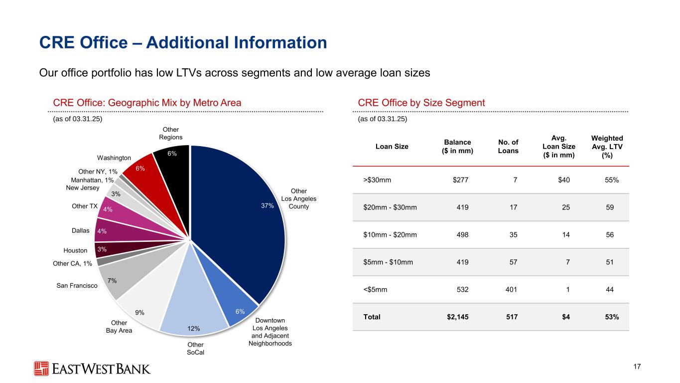 < = 50% 49% > 50%至55% 15% > 55%至60% 15% > 60%至65% 13% > 65%至70% 5% > 70% 3%商业地产投资组合详情16我们的CRE投资组合是细粒度的-许多贷款有充分追索权和个人担保49%按贷款价值比(LTV)1规模和按物业类型划分的LTV平均分布(截至03.3 1.25)(截至03.3 1.25)▪不到25%的CRE贷款的LTV超过60%总投资组合规模(十亿美元)加权平均。LTV1(%)平均贷款规模($ mm)Multifamily $ 5.051% $ 2 Retail 4.4473 Industrial 4.1463 Hotel 2.4529 Office 2.1534 Healthcare 0.85 24 Other 1.1494 Construction & Land2 0.65013 Total CRE $ 20.549% $ 3(1)加权平均LTV是基于最近的LTV,使用最近可用的评估和当前的贷款承诺(2)建筑和土地平均规模基于总承诺