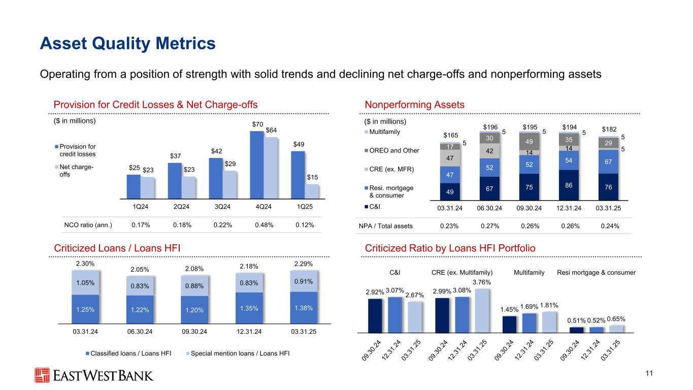 34.3% 36.9% 36.4% 1.20% 1.22% 1.27% 3Q24 4Q24 1Q25效率比非利息费用/平均资产总运营非利息费用1运营费用和效率10在为未来增长进行投资的同时保持同类最佳的效率(百万美元)(1)不包括税收抵免和CRA投资摊销的非利息费用总额(2)与存款相关的费用包括存款账户费用和存款保险费以及监管评估,包括FDIC特殊存款保险评估费用和2024年第一季度、2024年第二季度、2024年第四季度分别为1000万美元、200万美元、(3)百万美元和83.3万美元的冲回,和1Q25分别(3)见附录和公司收益新闻稿中GAAP与非GAAP财务指标的对账,突出效率比率3和经营非利息费用/平均资产比率薪酬和员工福利计算机和软件相关费用,所有其他占用及设备押金相关费用2-4 %-4 % + 5% + 13%▪总运营非利息费用为236mm −不包括16mm的税收抵免和CRA投资摊销费用与上一季度相比Q-O-Q + 3% 161517161632232117194448465855142133136140146 $ 234 $ 219 $ 220 $ 231 $ 236 1Q24 2Q24 3Q24 4Q24 1Q25