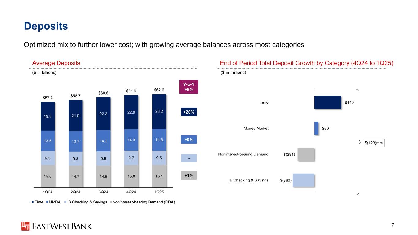 + $ 526mm贷款6稳定、平衡的增长正在支持多元化和利润率扩张(十亿美元)平均贷款期末按类别划分的总贷款增长(Q4至1Q25)(百万美元)15.4 15.3 15.1 15.3 15.45.05.05.55.05.0 15.2 15.4 15.7 15.9 16.1 16.3 16.2 16.5 17.0 16.8 $ 51.9 $ 51.9 $ 52.4 $ 53.2 $ 53.3 1Q24 2Q24 3Q24 4Q24 1Q25 + 6%-+ 4% Y-o-Y + 3%-1 % C & I CRE(ex。MultiFamily)住宅抵押贷款和其他消费者MultiFamily Q-o-Q + 1%(4% ann.)$ 55 $ 64 $ 200 $ 207 MultiFamily C & I CRE(ex。多户)住宅按揭&其他消费者