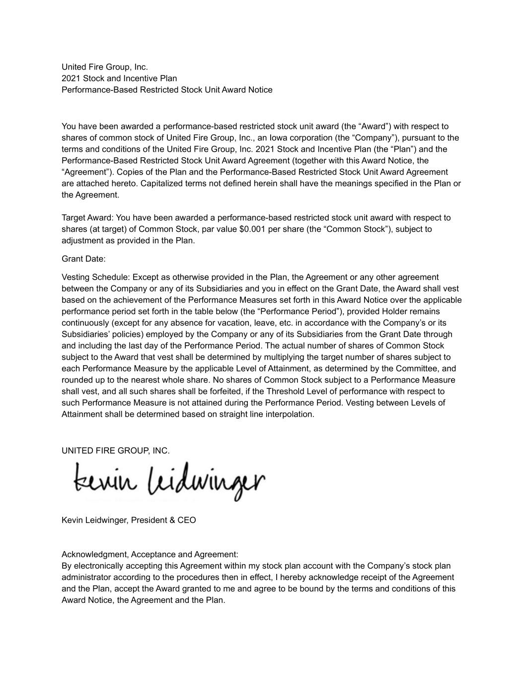 根据《United Fire Group, Inc. 2021年股票和激励计划》(“计划”)以及《基于业绩的限制性股票授予协议》(连同本授予通知,“协议”)的条款和条件,您已就爱荷华州公司(“公司”)的United Fire Group, Inc.普通股股份获得基于业绩的限制性股票单位奖励(“奖励”)。该计划及基于业绩的限制性股票授予协议副本随函附上。此处未定义的大写术语应具有计划或协议中规定的含义。目标奖励:就每股面值0.00 1美元的普通股(按目标)股份(“普通股”)而言,您已获得基于业绩的限制性股票单位奖励,但可能会根据计划中的规定进行调整。授予日:归属附表:除计划、协议或公司或其任何附属公司与阁下于授予日生效的任何其他协议另有规定外,奖励须根据本奖励通知书所载的绩效计量在下表所列适用的绩效期间(“绩效期间”)的达成情况归属,但持有人须持续留任(除非因休假、休假、等根据公司或其附属公司的政策)受雇于公司或其任何附属公司自授予日起至履约期最后一天(包括该日)止。授予的受奖励普通股的实际股份数量应通过将受每项绩效衡量标准约束的目标股份数量乘以委员会确定的适用的达到水平来确定,并四舍五入到最接近的整股。任何受业绩计量约束的普通股股份均不得归属,如果在业绩期间未达到与该业绩计量相关的业绩门槛水平,则所有该等股份将被没收。应根据直线插值确定达到级别之间的归属。United Fire Group, Inc.总裁兼首席执行官Kevin Leidwinger确认、接受和同意:通过按照当时有效的程序在公司股票计划管理人处以电子方式接受我的股票计划账户内的本协议,本人在此确认已收到该协议和该计划,接受授予我的奖励并同意受本奖励通知、该协议和该计划的条款和条件的约束。