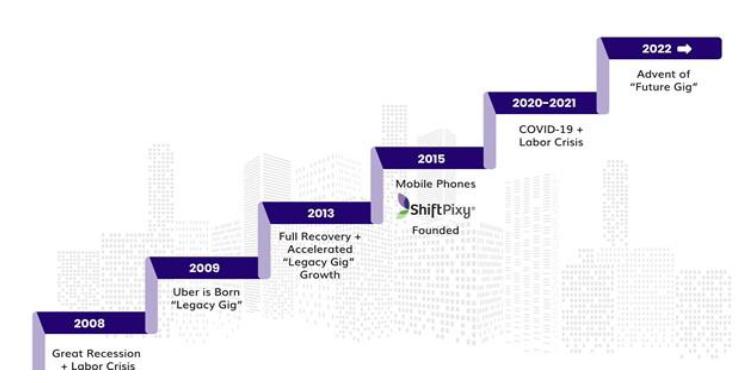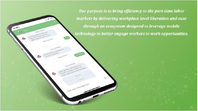 我们设计了业务平台,以满足不断变化的劳动力和不断变化的工作环境的需求。我们相信,我们的方法和强大的技术将受益于观察到的人口工作场所从传统的员工/雇主关系转向日益灵活的工作环境,这是零工经济的特征。我们认为,这种方法的变化始于2008年金融危机之后,目前是由新冠病毒经济危机造成的劳动力短缺所驱动的。我们还认为,支撑低工资劳动力危机的一个重要问题是寻找工人,以及将临时工或零工与短期工作机会匹配。
