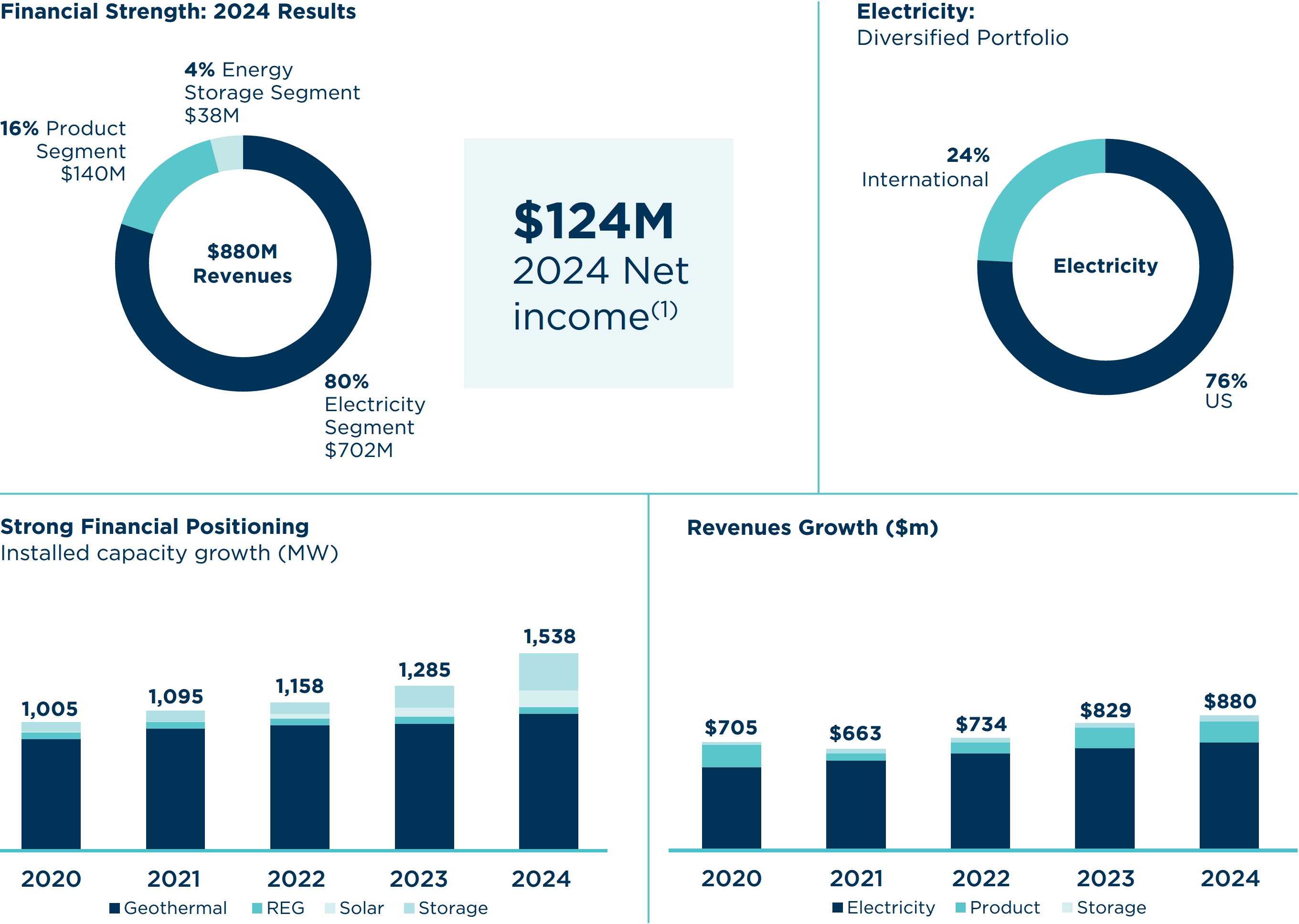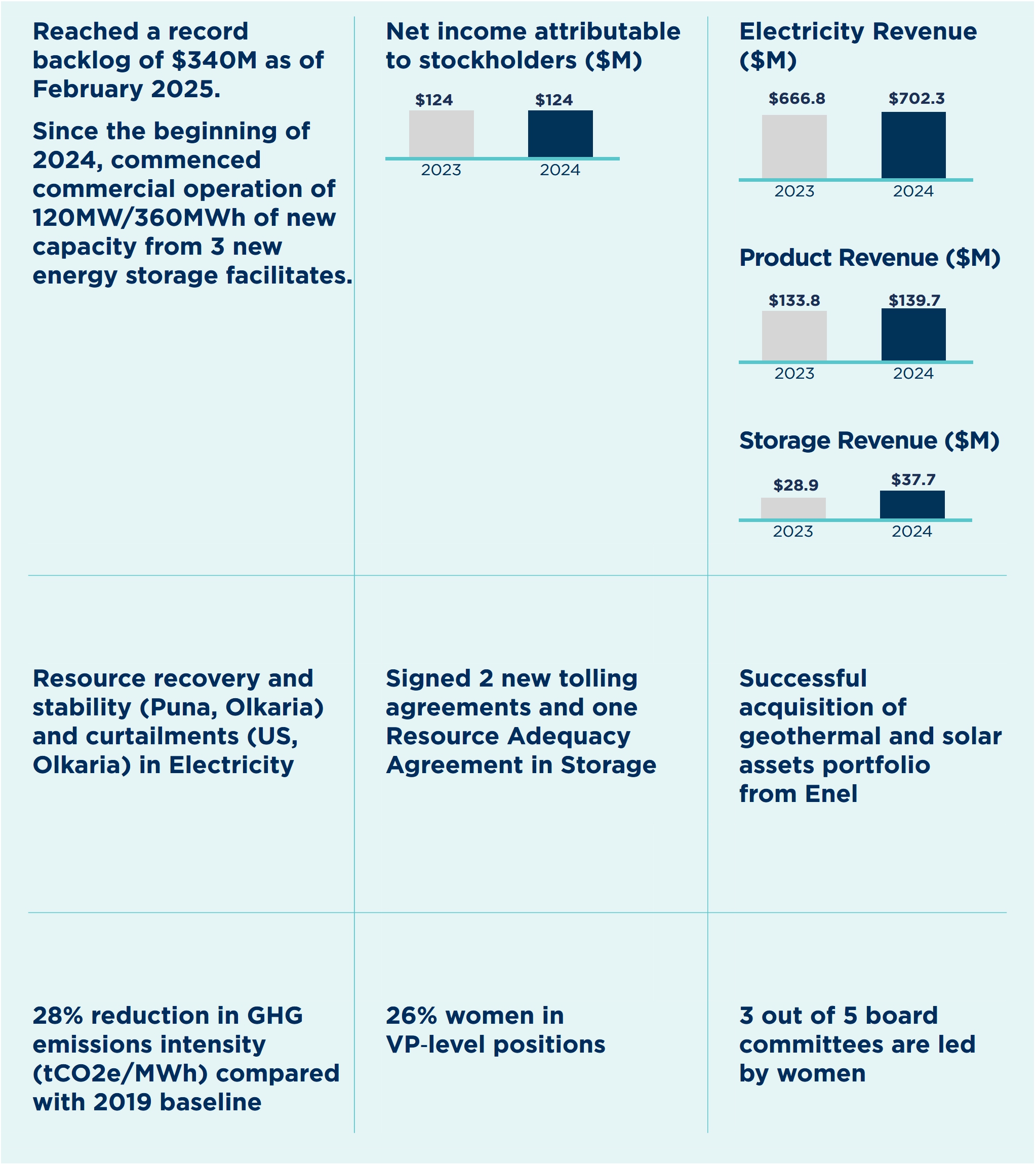 2024年,我们成功启动并运营了三个新的存储项目,签署了三个新的存储项目PPA和一个资源充足协议,完成了11兆瓦的地热再发电,并在世界各地进行了几次成功的钻探活动。此外,我们的产品部门签署了总额为2.5亿美元的合同,为第三方建造地热发电厂。我们还开设了一个新的美国公司办公室,整合了来自三个不同地点的员工队伍,以促进更好的内部协作并推动我们的公司向前发展。
