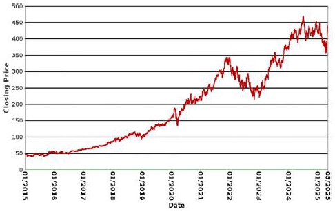 下图显示了2015年1月1日至2025年5月8日期间MSFT在其一级交易所的每日历史表现。我们从Bloomberg L.P.获得了这一历史数据。我们对定价日从Bloomberg L.P.获得的信息的准确性或完整性未进行独立验证,MSFT收盘市价为438.17美元。下图可能已经调整,以反映某些公司行为,例如股票拆分和反向股票拆分。