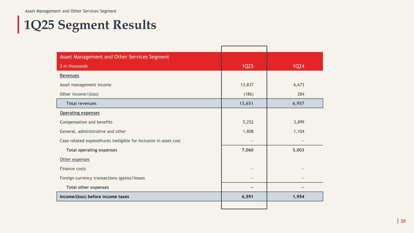 资产管理和其他服务部门资产管理和其他服务部门千美元1Q25 1Q24收入资产管理收入13,8376,673其他收入/(亏损)(186)284总收入13,6516,957运营费用薪酬和福利5,2523,899一般、行政和其他1,8081,104与案件相关的支出不符合资产成本---总运营费用7,0605,003其他费用财务成本---外币交易(收益)/亏损---其他费用总额---所得税前收入/(亏损)6,5911,954 1Q25分部业绩20